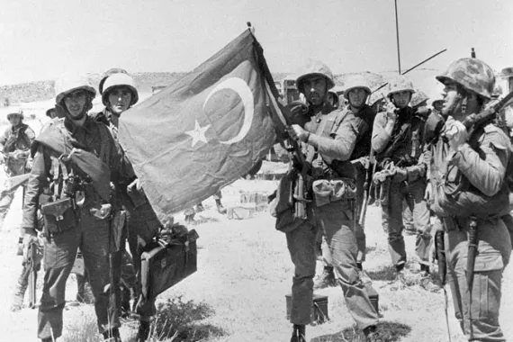 • Τουρκική εισβολή στις 20-7-1974 δυτικά της Κερύνειας μετά από βομβαρδισμό από αέρα και κανονιοβολισμό από θάλασσα. Προσπάθειες να καταλάβουν το αεροδρόμιο της Λευκωσίας και το στρατόπεδο της ΕΛΔΥΚ χωρίς επιτυχία. Εξουδετέρωση όλων των κινήσεων των Τουρκοκυπρίων από την Εθνική Φρουρά. Οι εμπόλεμοι δέχτηκαν κατάπαυση του πυρός από το Συμβούλιο Ασφαλείας για τις 4 μ.μ. της 22ας Ιουλίου. Προώθηση Τούρκων ύπουλα προς Κερύνεια την οποία βρήκαν ανυπεράσπιστη. Η εισβολή σήμανε το τέλος της Χούντας. Μεταβατική κυβέρνηση με Καραμανλή ο οποίος επέστρεψε στη χώρα στις 24-7-1974. Πραγματικό χάος. Ανταποκρινόμενος στο ψήφισμα 353 της 20ης Ιουλίου του Συμβουλίου Ασφαλείας δέχτηκε διαπραγματεύσεις με τη συμμετοχή των δύο υπερδυνάμεων (Βιέννη 1-18-7-1974).