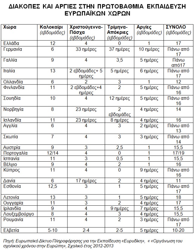 Όπως αποδεικνύεται από τα στοιχεία για την Οργάνωση του σχολικού χρόνου στην Πρωτοβάθμια Εκπαίδευση της Ευρώπης, η Ελλάδα δεν έχει τις μεγαλύτερες διακοπές και αργίες. Οκτώ (8) τουλάχιστον ευρωπαϊκές χώρες έχουν περισσότερες ημέρες διακοπών και αργιών ως σύνολο, ανάμεσά τους η Γερμανία, η Γαλλία, η Ιταλία, η Πορτογαλία, η Ρουμανία, η Λετονία, η Εσθονία, η Ελβετία.