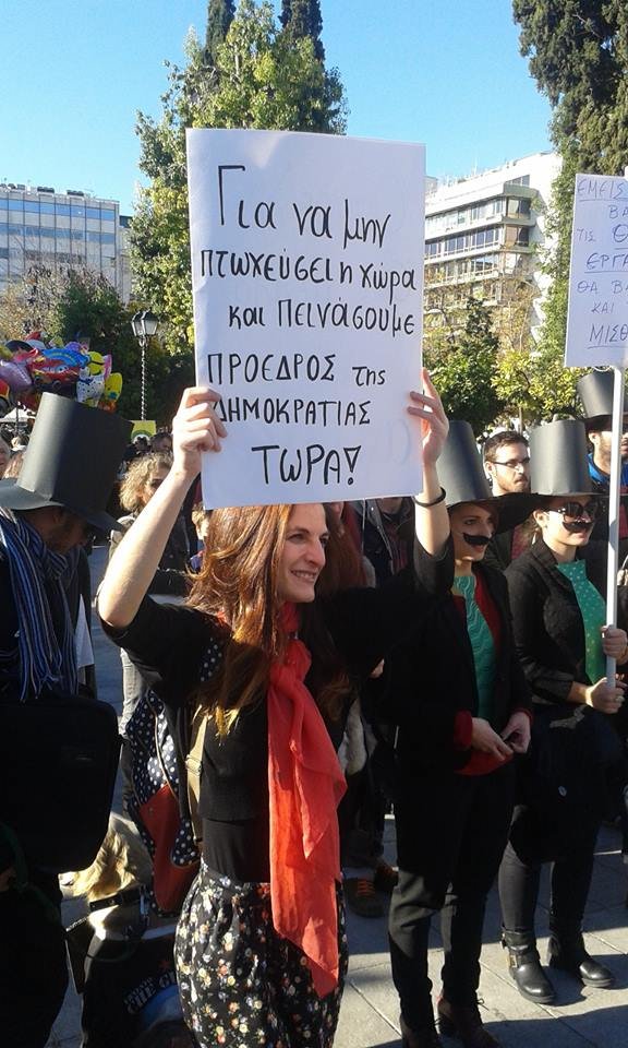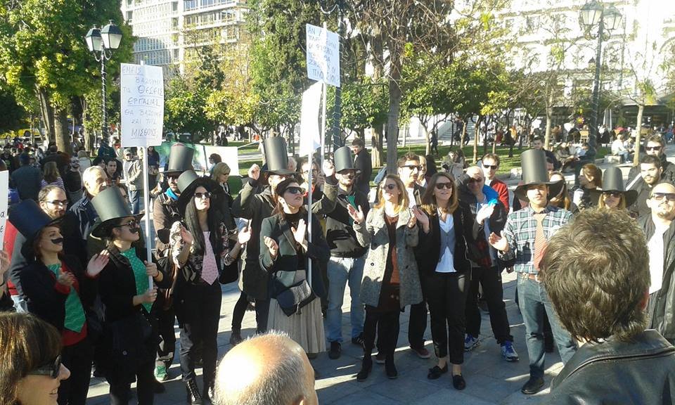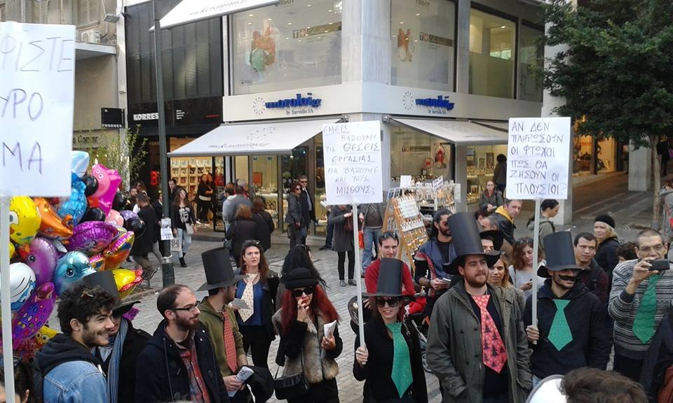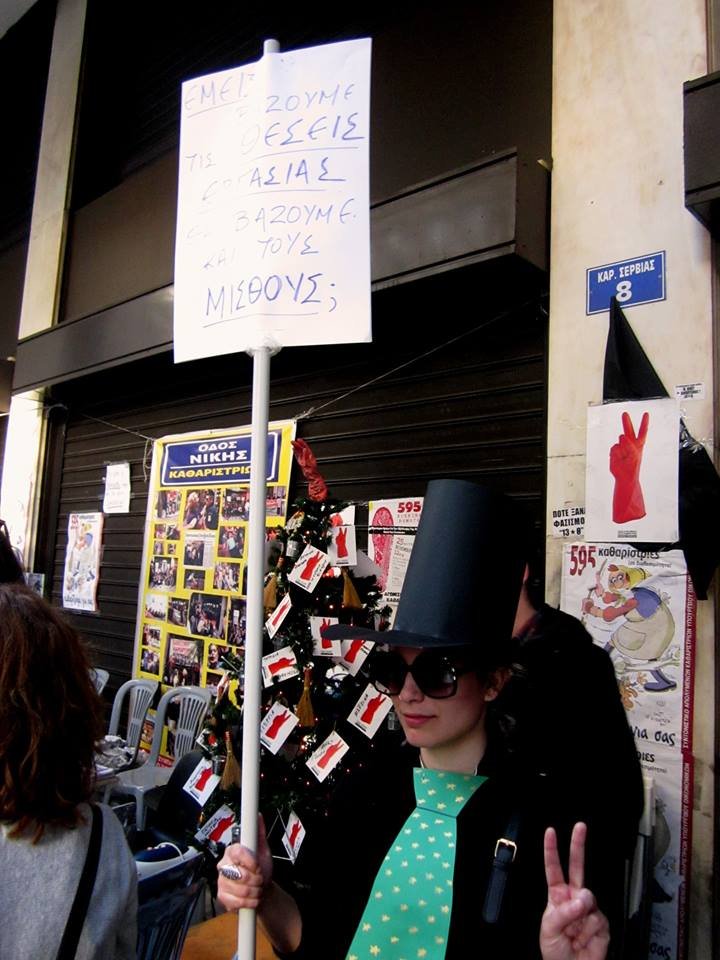 “Εμείς βάζουμε τις δουλειές, δεν θα βάζουμε και τα λεφτά. Στην περίπτωση των καθαριστριών, δεν βάζουμε ούτε δουλειές, βέβαια, γιατί πρέπει κάποιοι να φτωχύνουν κι άλλο, για να μπορούμε και εμείς να πλουτίσουμε. Η λογική το λέει και ο Αντωνάκης μας. Η εθελοντική εργασία είναι το μέλλον και πρέπει να το καταλάβουν όλοι. Καλούμε λοιπόν τις καθαρίστριες του ΥΠΟΙΚ να αποχωρήσουν από το σημείο γιατί θέλουμε να το κάνουμε φάτνη εν όψει Χριστουγέννων”.