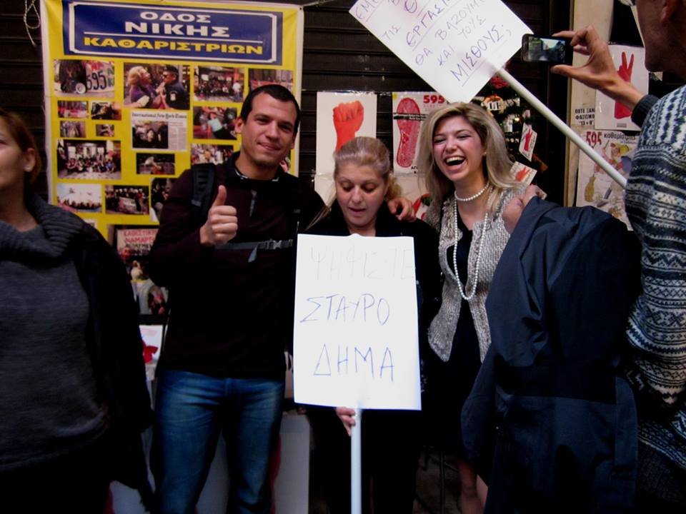 Οι καθαρίστριες δυστυχώς δεν πείστηκαν. Έτσι και εμείς χαιρετήσαμε τα ΜΑΤ που έχει στείλει η καλή κυβερνησούλα μας να κάθονται εκεί, δίπλα τους και να τις προσέχουν από τους κακούς.”