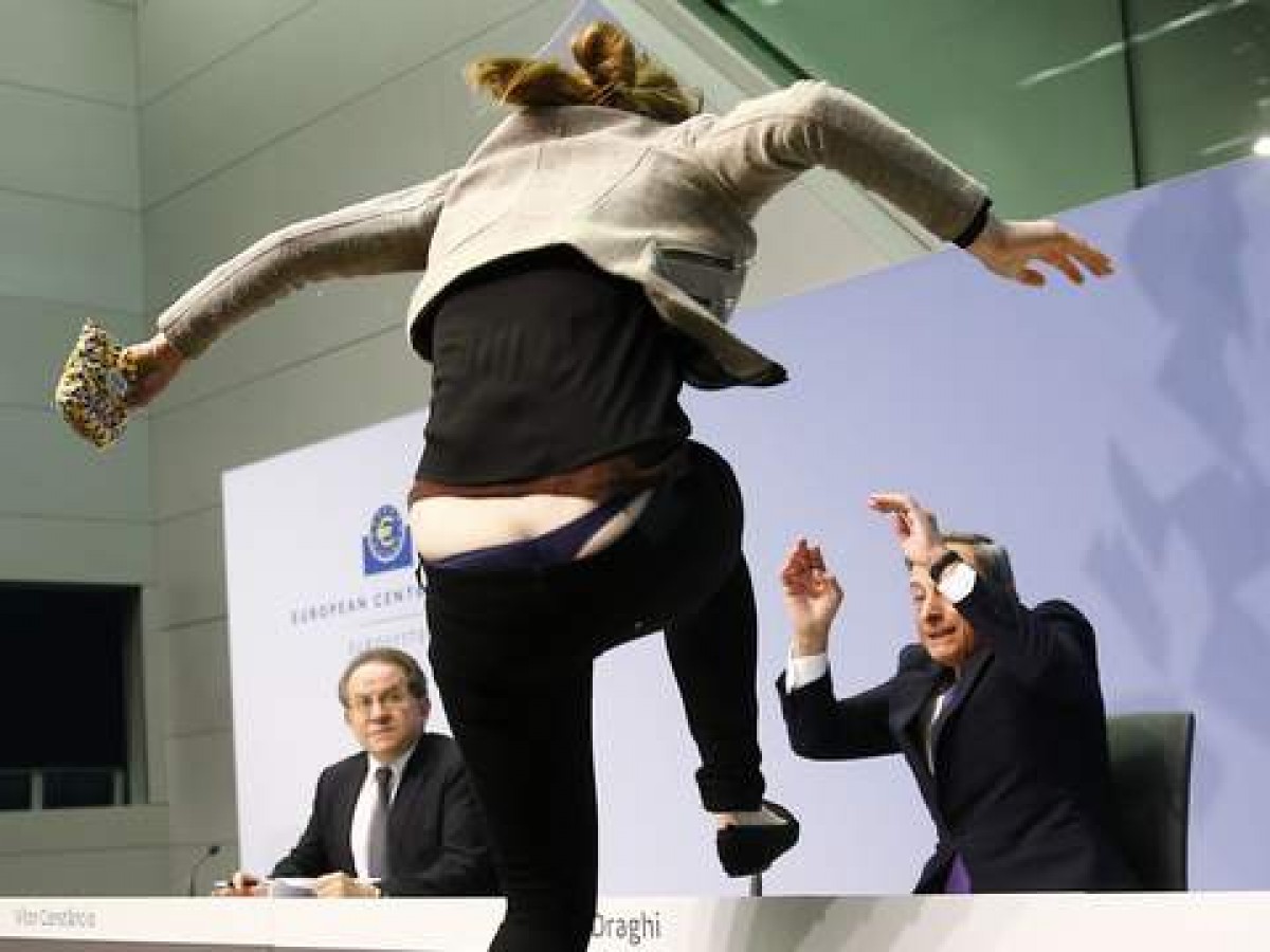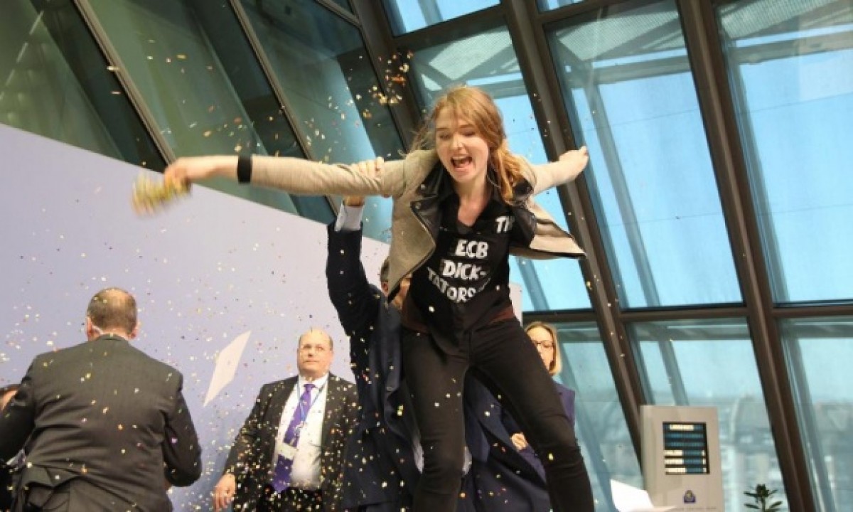 Διαδηλώτρια μπήκε στον χώρο της συνέντευξης και άρχισε να φωνάζει «τέλος στη δικτατορία της ΕΚΤ». Η διαδηλώτρια, που πέταξε κονφετί στον Ντράγκι, απομακρύνθηκε αμέσως από αστυνομικούς.