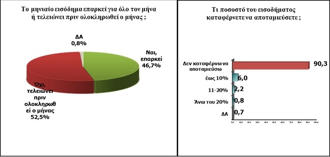 Επιπλέον το 12,7% των νοικοκυριών δήλωσε ότι τα εισοδήματά του δεν επαρκούν για να καλύψουν ούτε τις βασικές τους ανάγκες, Δύο στα 10 νοικοκυριά δήλωσαν ότι δεν θα μπορούσαν να ανταποκριθούν σε μια έκτακτη ανάγκη ύψους 500 ευρώ, ενώ το 45% θα κάλυπτε αυτή τη δαπάνη με μεγάλη δυσκολία. Περισσότερο από 1 στα 2 νοικοκυριά δηλώνει ότι το μηνιαίο εισόδημα δεν επαρκεί για όλο τον μήνα. Για αυτά τα νοικοκυριά το μηνιαίο εισόδημα επαρκεί κατά μέσο όρο για 19 ημέρες.
