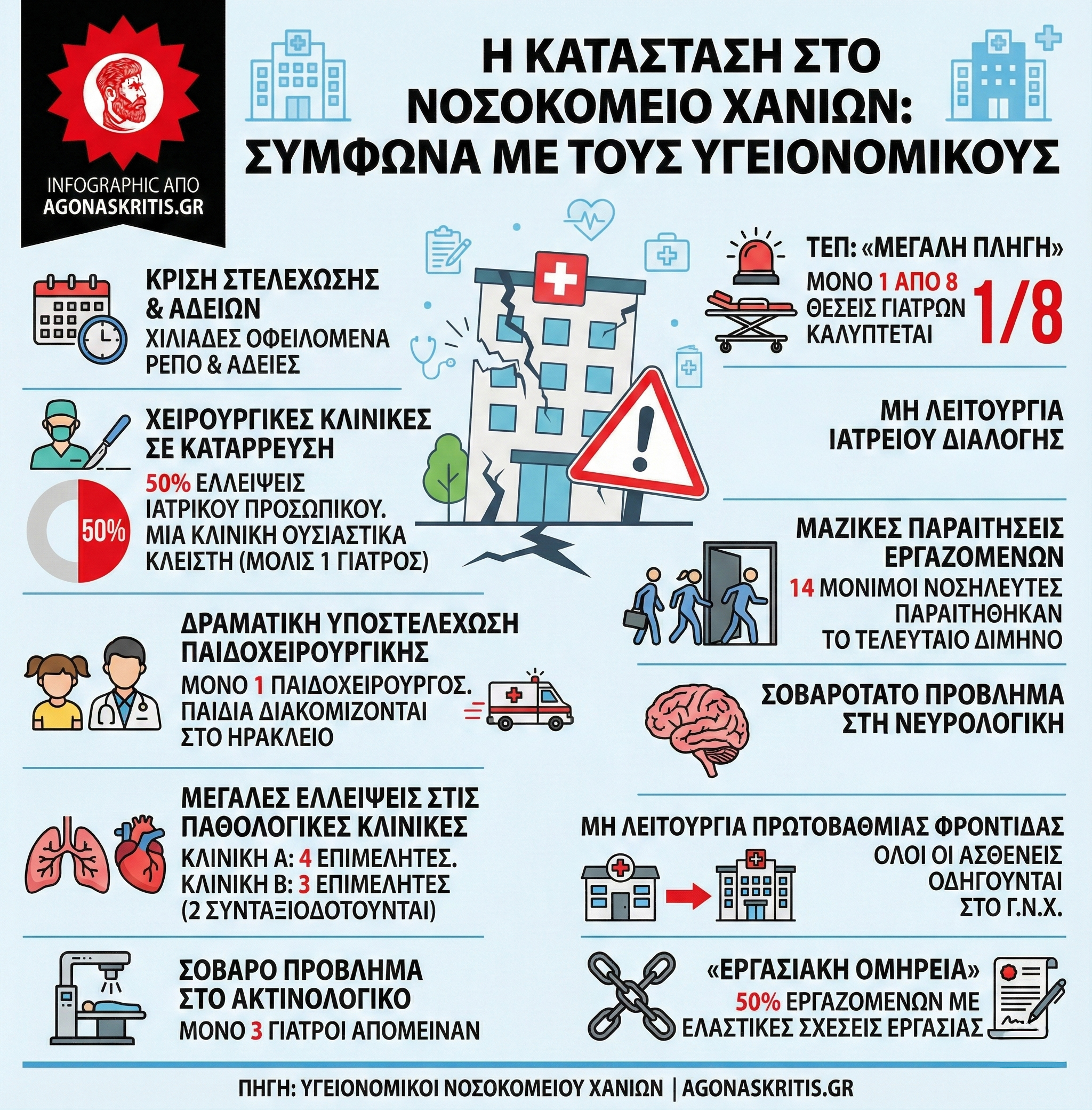 Σύμφωνα με τα στοιχεία των υγειονομικών, η εικόνα στο Γενικό Νοσοκομείο Χανίων είναι ενδεικτική της συνολικότερης κατάρρευσης των δημόσιων δομών Υγείας στο νησί. Οι εργαζόμενοι περιγράφουν: