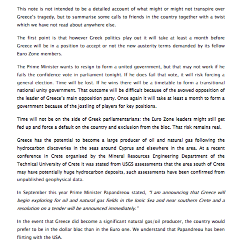 Στο συγκεκριμένο έγγραφο αναφέρεται στις προβλέψεις του πληροφοριοδότη αναφορικά με το τι πρόκειται να συμβεί με την κυβέρνηση Παπανδρέου, τις πιθανότητες συγκυβέρνησης καθώς και τις πιέσεις από την Ε.Ε.