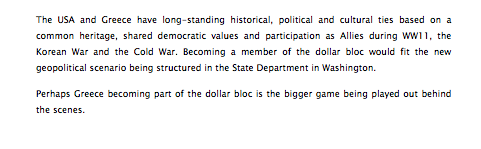 Μάλιστα, όπως σημειώνει ο συντάκτης της έκθεσης «το να γίνει η Ελλάδα μέλος της ζώνης του δολαρίου είναι το μεγαλύτερο παιχνίδι που παίζεται στα παρασκήνια»