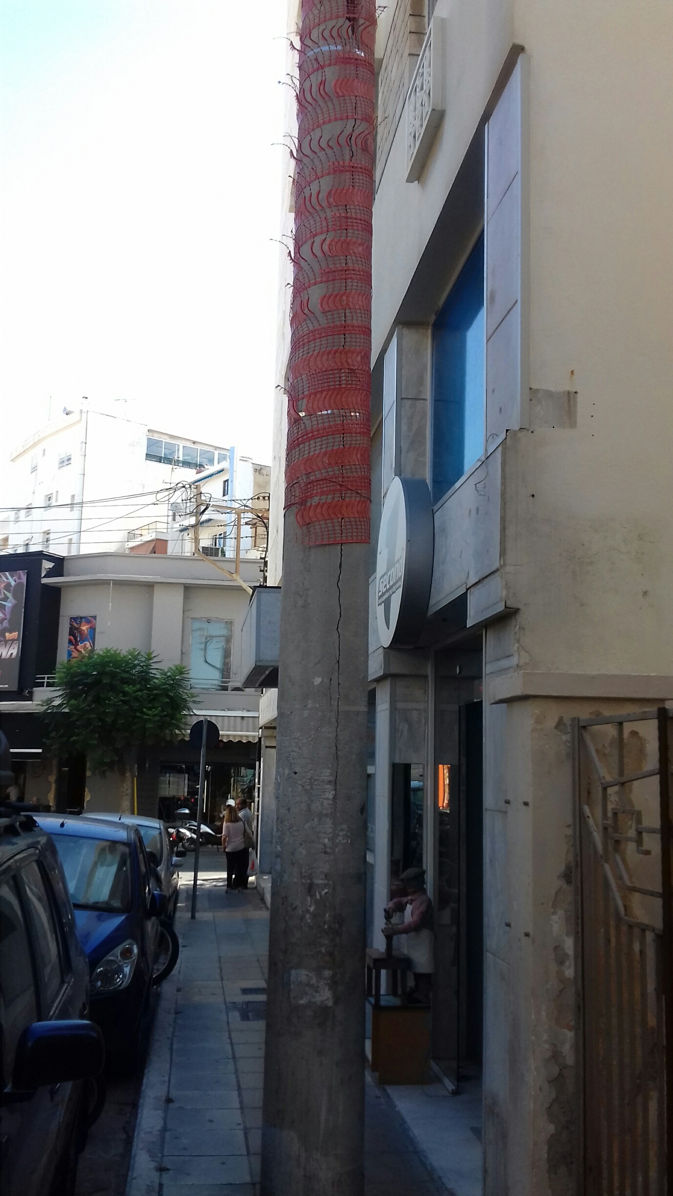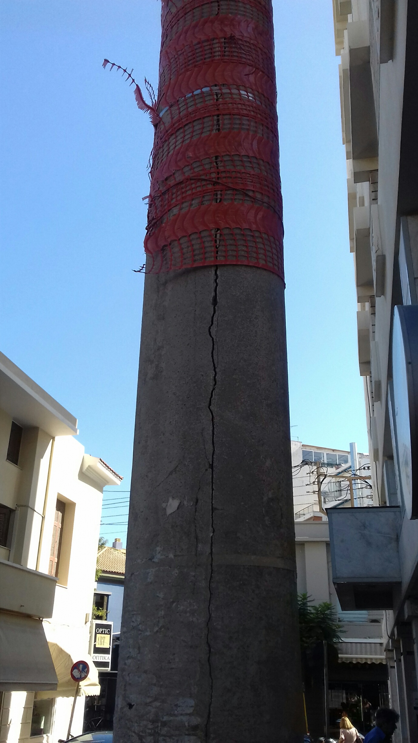 Η κολώνα αυτή έχει υποστεί διάβρωση, έχει σκάσει και στην βάση και από την μέση ως την κορυφή με αποτέλεσμα να πέφτουν κομμάτια τσιμέντου στο πολυσύχναστο πεζοδρόμιο.