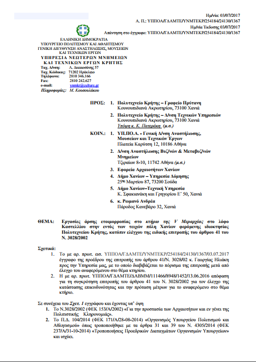 Το Πολυτεχνείο Κρήτης χθες (03/07/2017) έλαβε με βαθιά ανησυχία έγγραφο της απόφασης της τοπικής υπηρεσίας «Νεώτερων Μνημείων και Τεχνικών Έργων Κρήτης» του Υπουργείου Πολιτισμού και Αθλητισμού με θέμα «Εργασίες Άρσης Ετοιμορροπίας στο κτίριο της V Μεραρχίας στο λόφο Καστελλίου στην εντός των τοιχών πόλη Χανίων φερόμενης ιδιοκτησίας Πολυτεχνείου Κρήτης, κατόπιν ελέγχου της ειδικής επιτροπής του άρθρου 41 του Νόμου 3028/2002». Το έγγραφο συνοδεύεται από το Πρακτικό με το αναλυτικό πόρισμα της επιτροπής και συνοδευτικό φωτογραφικό υλικό.