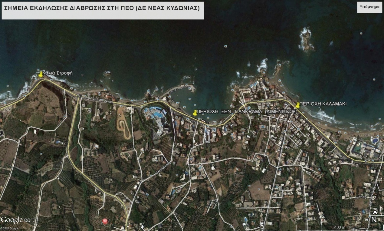 • Το τμήμα της Παλιάς Εθνικής Οδού (Π.Ε.Ο.) στη Δ.Ε. Νέας Κυδωνίας, όπου έχουν εντοπιστεί σημεία διάβρωσης της οδού στο Καλαμάκι, στο Λιμενίσκο κοντά στην  περιοχή του Ξενοδοχείου Πανόραμα και στη θέση «Κακιά Στροφή».