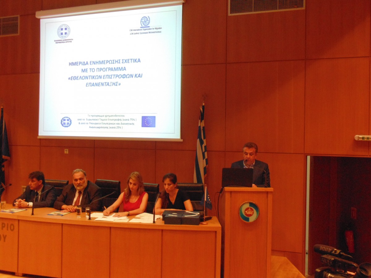 Περισσότεροι από 28.000 πρόσφυγες-μετανάστες έχουν επιστρέψει από την χώρα μας στις πατρίδες τους στο πλαίσιο υλοποίησης του Ευρωπαϊκού Προγράμματος «Εθελοντικών Επιστροφών και Επανένταξης» που παρουσιάστηκε σήμερα σε ειδική ημερίδα που πραγματοποιήθηκε στο Επιμελητήριο Ηρακλείου, παρουσία του Περιφερειάρχη Κρήτης, Αντιπεριφερειαρχών, του δημάρχου Ηρακλείου, Σητείας, Αστυνομικών, Λιμενικών Αρχών, φορέων, εθελοντών και στελεχών εμπλεκόμενων υπηρεσιών. Στην σημερινή ημερίδα που συνδιοργάνωσαν η Περιφέρεια Κρήτης και το Γραφείο Ελλάδος του Διεθνούς Οργανισμού Μετανάστευσης (ΔΟΜ) παραβρέθηκε και μίλησε ο επικεφαλής του Οργανισμού στην χώρα μας Δανιήλ Εσδράς.