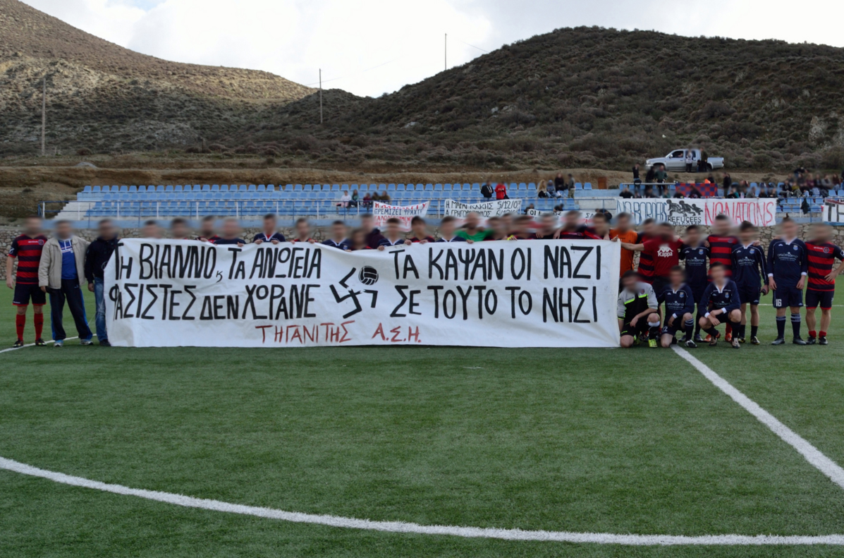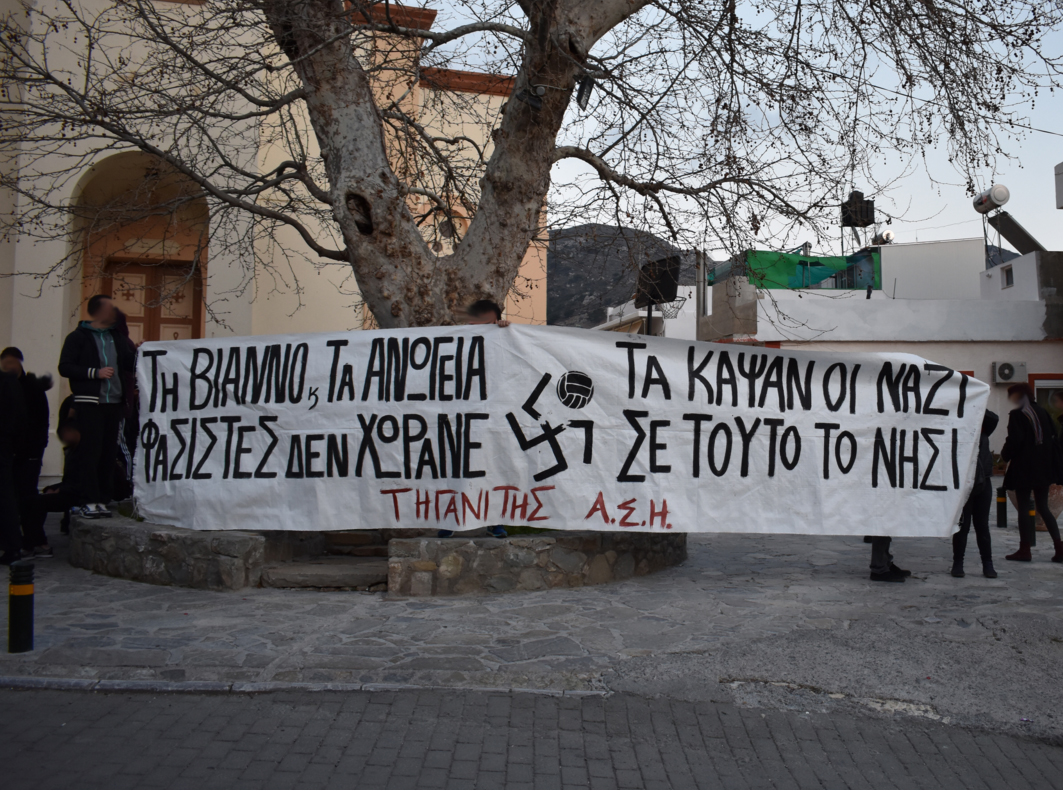 Την Κυριακή 19/2 ήταν προγραμματισμένος ο αγώνας Πατούχας – Τηγανίτης στο χωριό της Βιάννου. Δεδομένης της ιστορίας του χωριού, καθώς αποτελεί το δεύτερο μεγαλύτερο ολοκαύτωμα των ναζί, μετά απο αυτό των Καλαβρύτων, ομάδα αντιφασιστών επέλεξε να μην μείνει μόνο στο αθλητικό κομμάτι. Έτσι  100 αντιφασίστες/τριες μεταβήκαν απο το πρωί στο χωριό της Βιάννου. Αρχικά,  πριν τον αγώνα σηκώθηκε πανό απο παίκτες και των δύο ομάδων που έγραφε “Τη Βιάννο και τα Ανώγεια τα κάψαν οι ναζί, φασίστες δε χωράνε σε τούτο το νησί”. Καθόλη τη διάρκεια του αγώνα ακούστηκαν αντιφασιστικά συνθήματα και συνθήματα αλληλεγγύης προς τους μετανάστες. Ακόμη, μετά τον αγώνα πραγματοποιήθηκε αντιφασιστική πορεία και μοίρασμα στην κεντρική πλατεία, στους γύρω δρόμους και στα καφενεία του χωριού, δράση η οποία είχε αρκετά μεγάλη απήχηση στους κατοίκους.