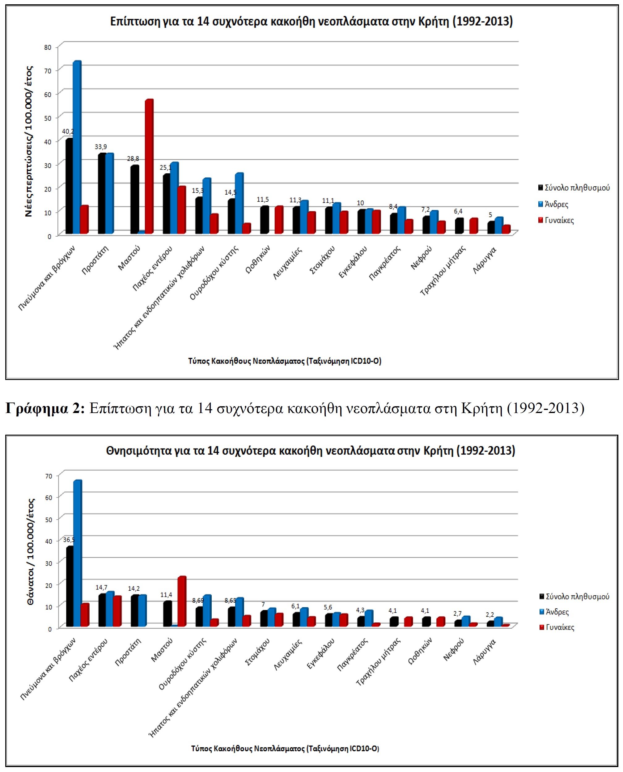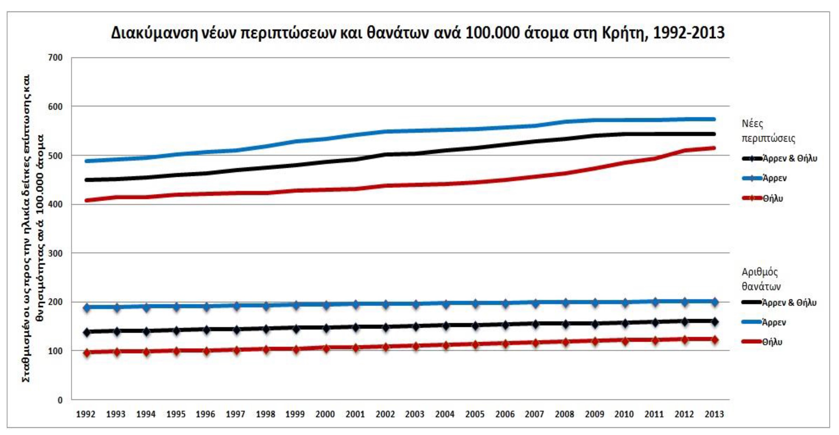 Σύμφωνα με τα αποτελέσματα που έδωσε στη δημοσιότητα το Κ.Κ.Κ., στα περιστατικά καρκίνου στους άντρες, έχουμε μεταξύ 1992 και 2013 μια αύξηση σχεδόν 28% (448,7 στις 574,2 ανά 100.000 κατοίκους). Στις γυναίκες το αντίστοιχο ποσοστό αύξησης πλησιάζει το 26% (408,2 στις 514,1 ανά 100.000 κατοίκους).