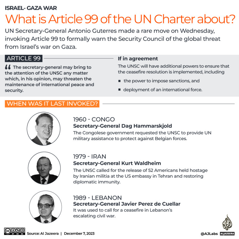 Στο άρθρο 99 του Χάρτη αναφέρεται ότι «ο Γενικός Γραμματέας μπορεί να θέσει υπόψη του Συμβουλίου Ασφαλείας κάθε θέμα που κατά τη γνώμη του μπορεί να απειλήσει τη διατήρηση της διεθνούς ειρήνης και ασφάλειας».