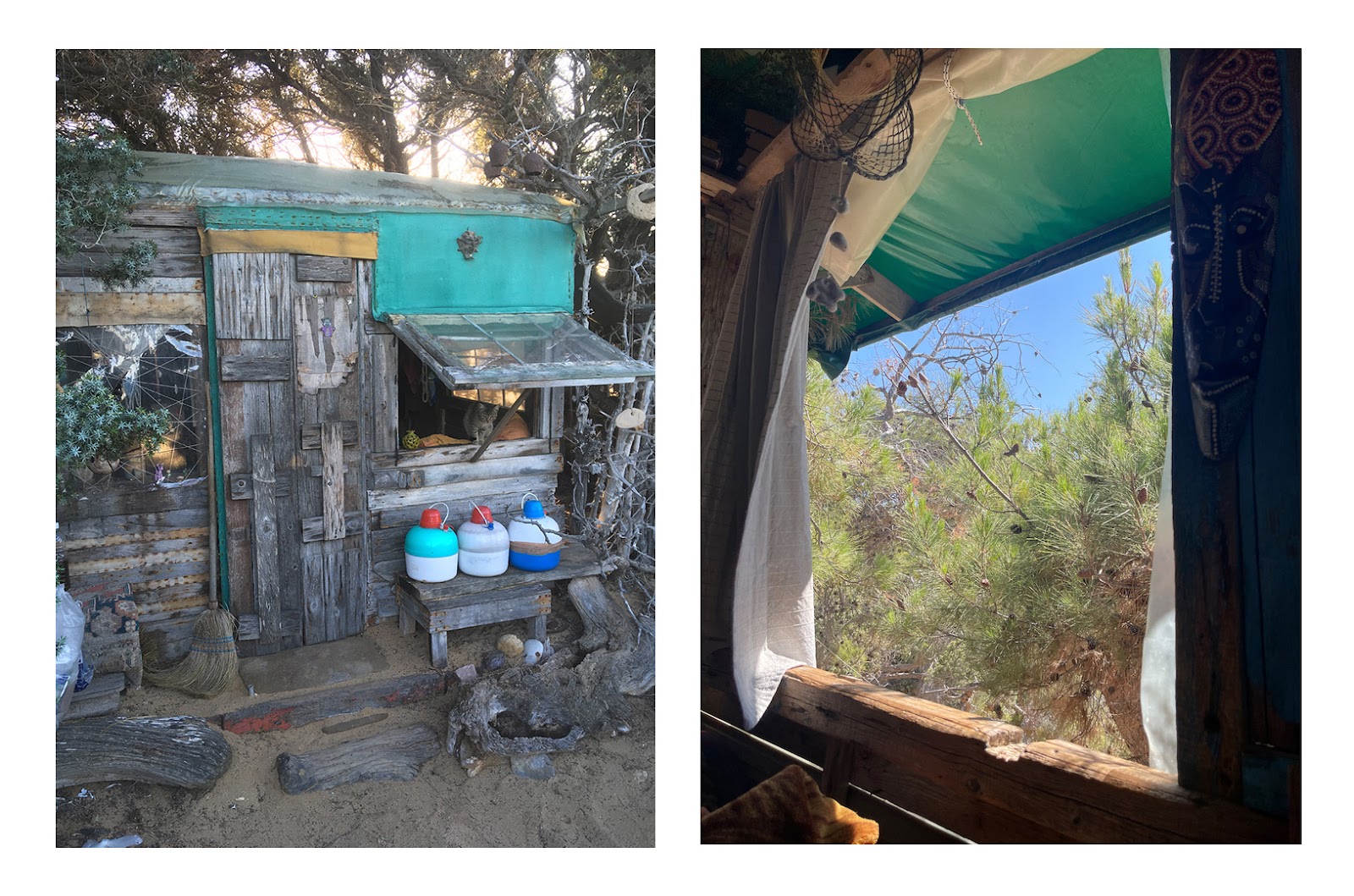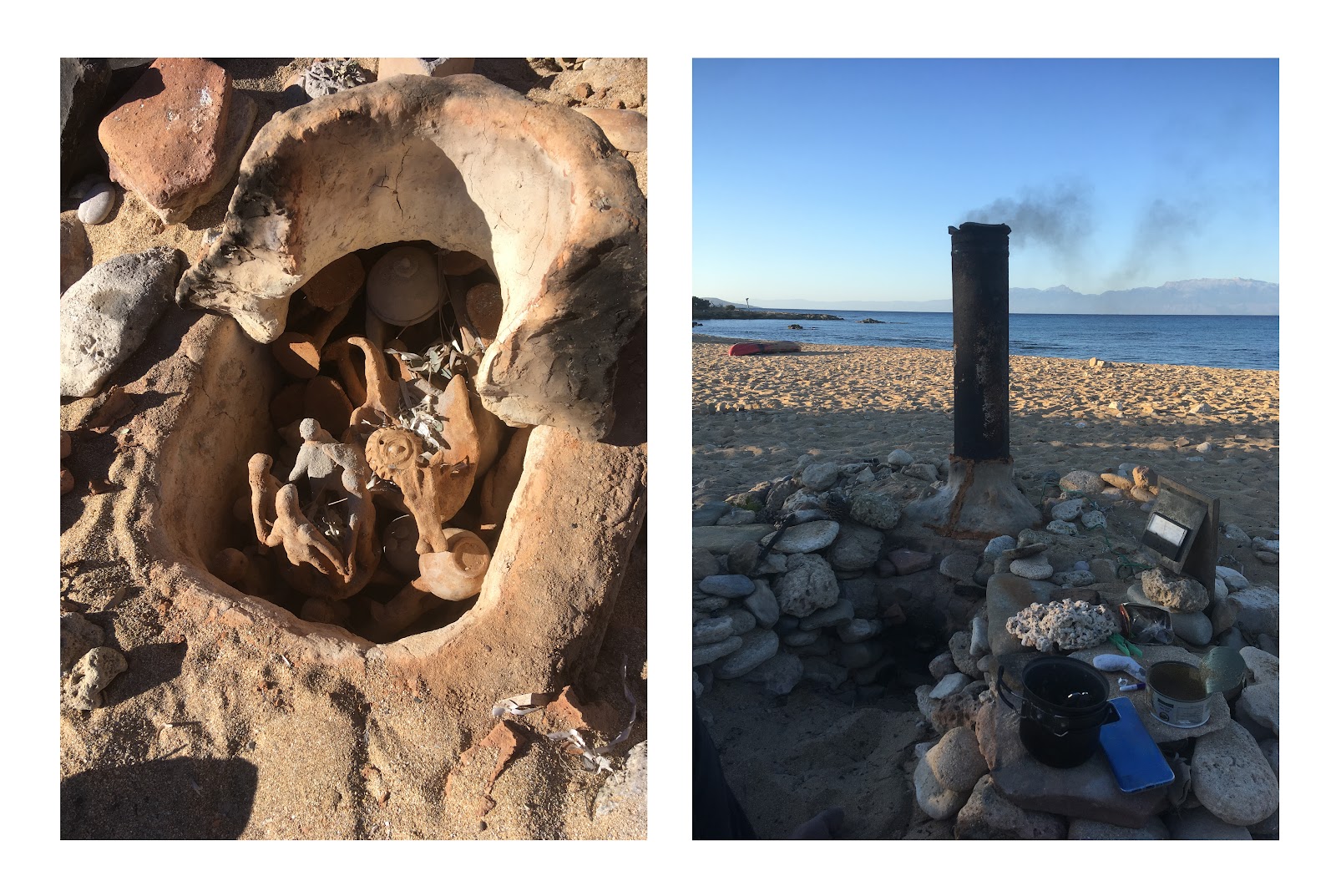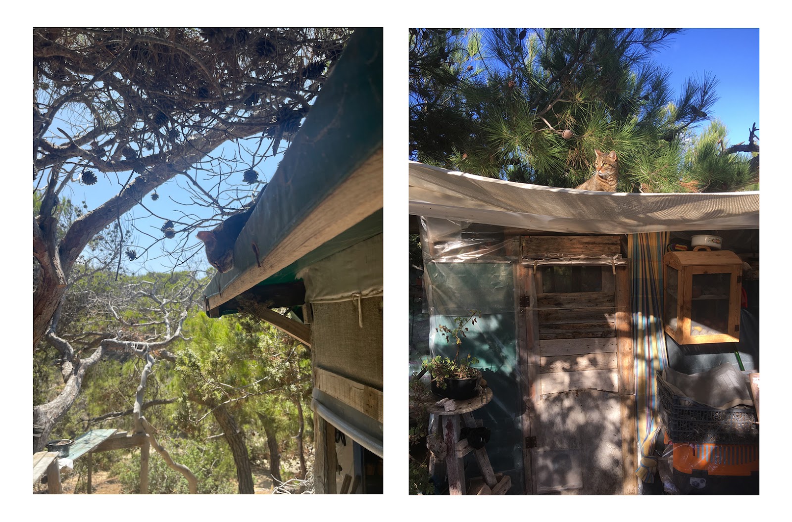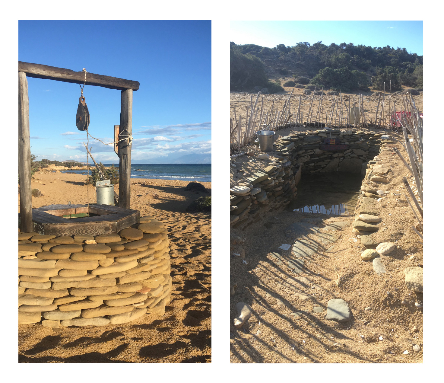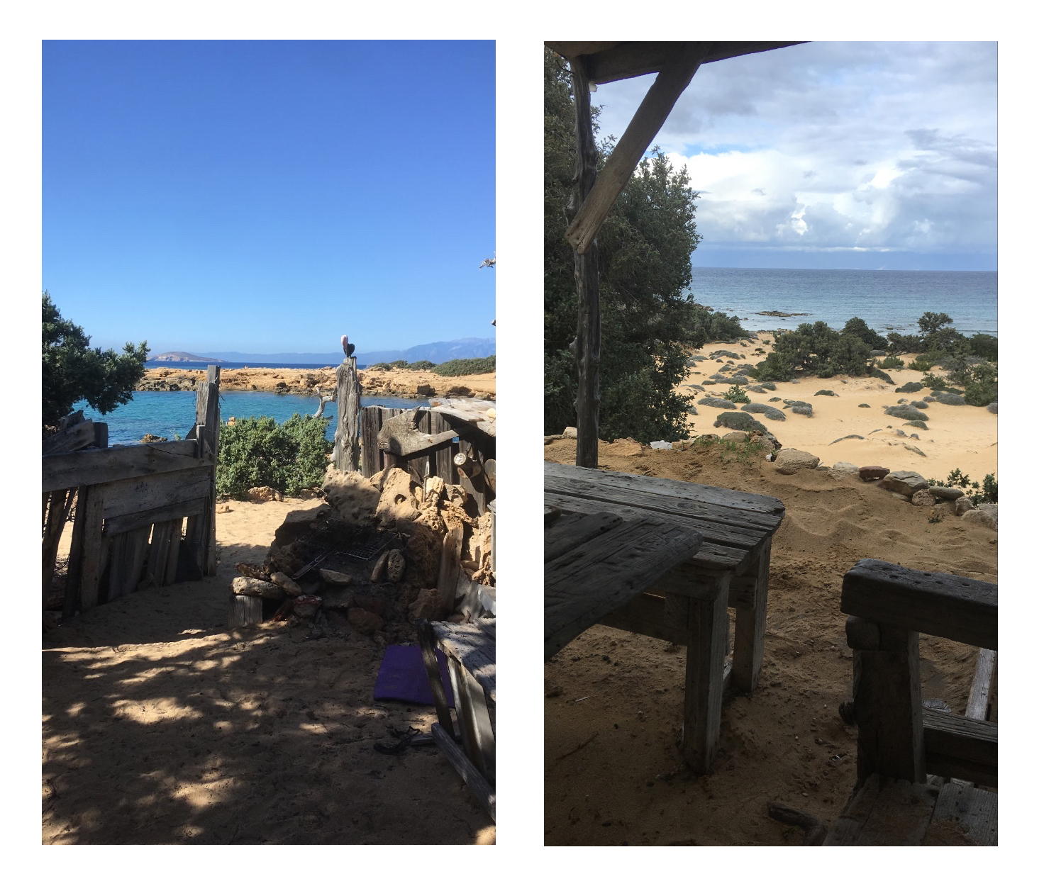 Από την παραλία του Λαυρακά και μετά —όταν πλέον έχεις απομακρυνθεί αρκετά από τον «πολιτισμό»— θα συναντήσεις και ένα πηγάδι, όπως και ένα μικρό πλυσταριό, κάπου κρυμμένο μπορεί να συναντήσεις και κανέναν αυτοσχέδιο πετρόφουρνο (κάπου εκεί βρίσκεται ακόμα και ένας αυτοσχέδιος κεραμικός κλίβανος, ο οποίος ξανακρύβεται μετά από κάθε χρήση!)… όλα φτιαγμένα από την «κοινότητα», δηλαδή από κόσμο που έχει αγαπήσει το νησί, που το νοιάζεται, και που το επισκέπτεται ξανά και ξανά. Μέχρι προχθές, σε δυο-τρία σημεία θα συναντούσες και μικρά «καφενεία» (όχι κάτι παραπάνω από ένα τραπέζι περιτριγυρισμένο από ένα-δυο ξύλινα παγκάκια, φτιαγμένα από ξύλα που έχει ξεβράσει η θάλασσα), σημεία σκιάς που αποτελούσαν κοινόχρηστους χώρους κοινωνικοποίησης: περνώντας από κει το καλοκαίρι έβλεπες κόσμο να κάθεται στη σκιά, να κουβεντιάζει, να παίζει σκάκι, να φτιάχνει καφέ, να παίζει ζωντανή μουσική, να ζωγραφίζει πέτρες με νερομπογιές, να διοργανώνει ολιγοήμερες εξορμήσεις σε (ακόμα πιο) απομακρυσμένες παραλίες… και με ένα απλό «γειά» μπορούσε ο οποιοσδήποτε να αναμιχθεί και να συμμετάσχει.
