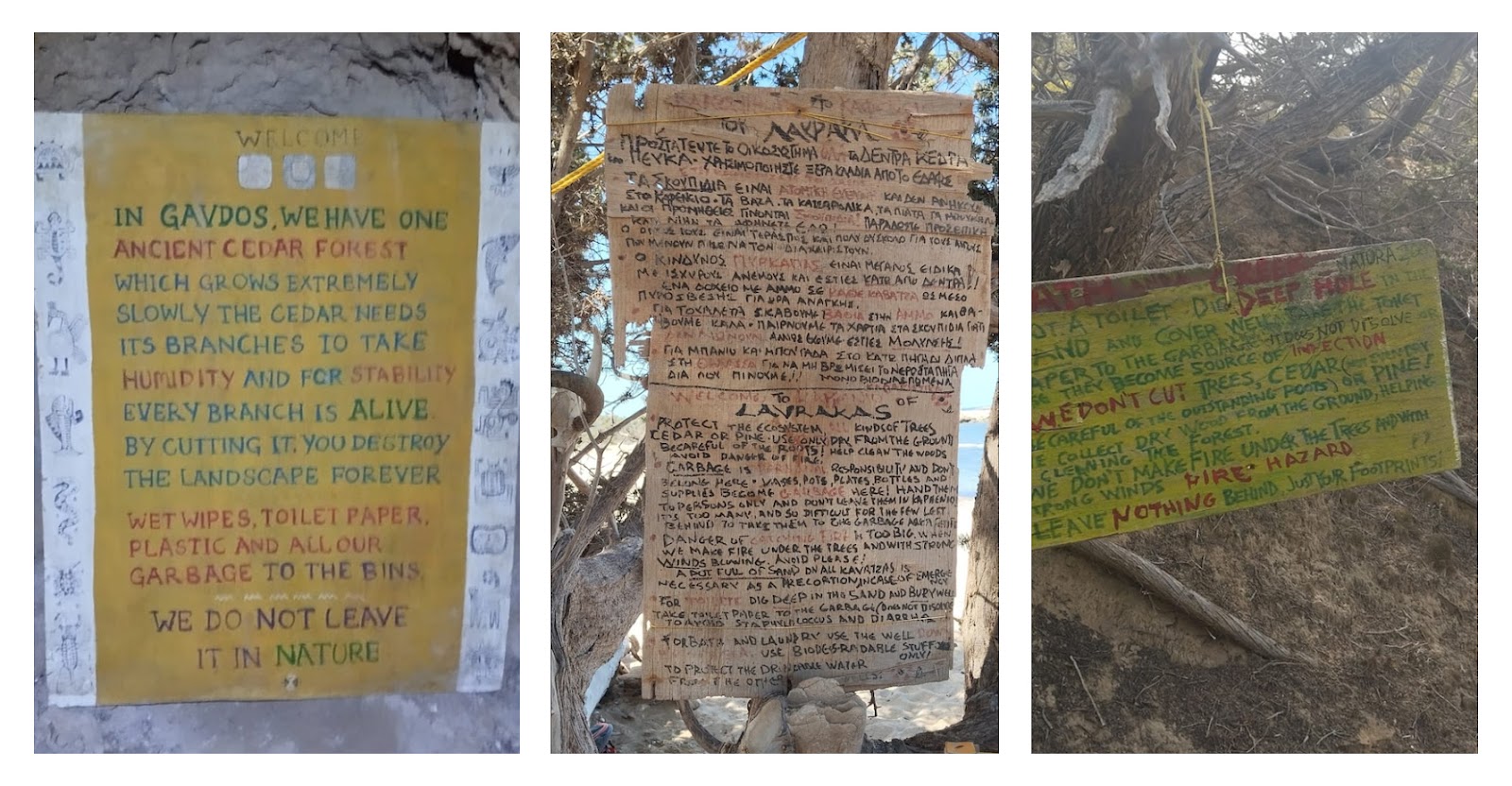 Η «κοινότητα» είχε τοποθετήσει και καλαίσθητες πινακίδες —ξύλινες και ζωγραφισμένες με μεράκι στο χέρι— οι οποίες ενημερώνουν τους επισκέπτες που ακόμα δεν γνωρίζουν το νησί για την ιδιαιτερότητα και την ευαισθησία του τοπικού περιβάλλοντος: οι κέδροι, που με το πλούσιο ριζικό τους σύστημα επιβραδύνουν την διάβρωση (στην οποία η Γαύδος —ένα νησί από άμμο, άργιλο και αμμόλιθους— είναι ιδιαιτέρως ευαίσθητη), σε αυτό το ξερό περιβάλλον μεγαλώνουν πολύ αργά: είναι σημαντικό οι επισκέπτες που δεν έχουν ακόμα αναπτύξει μια πιο ευαίσθητη αντίληψη για το πώς να συμβιώνουν με το οικοσύστημα, να τους προσέχουν, και να μην σπάνε καθόλου κλαδιά και ρίζες που τους «ενοχλούν»… Στην Γαύδο επικρατεί η κουλτούρα του να μην επιβάλεις την δική σου θέληση στο φυσικό τοπίο, αλλά να προσαρμόζεσαι εσύ σε αυτό. Επίσης, είναι σημαντική η ευαισθητοποίηση περί συλλογής όλων των σκουπιδιών, βιοδιασπώμενων σαπουνιών, κοκ.