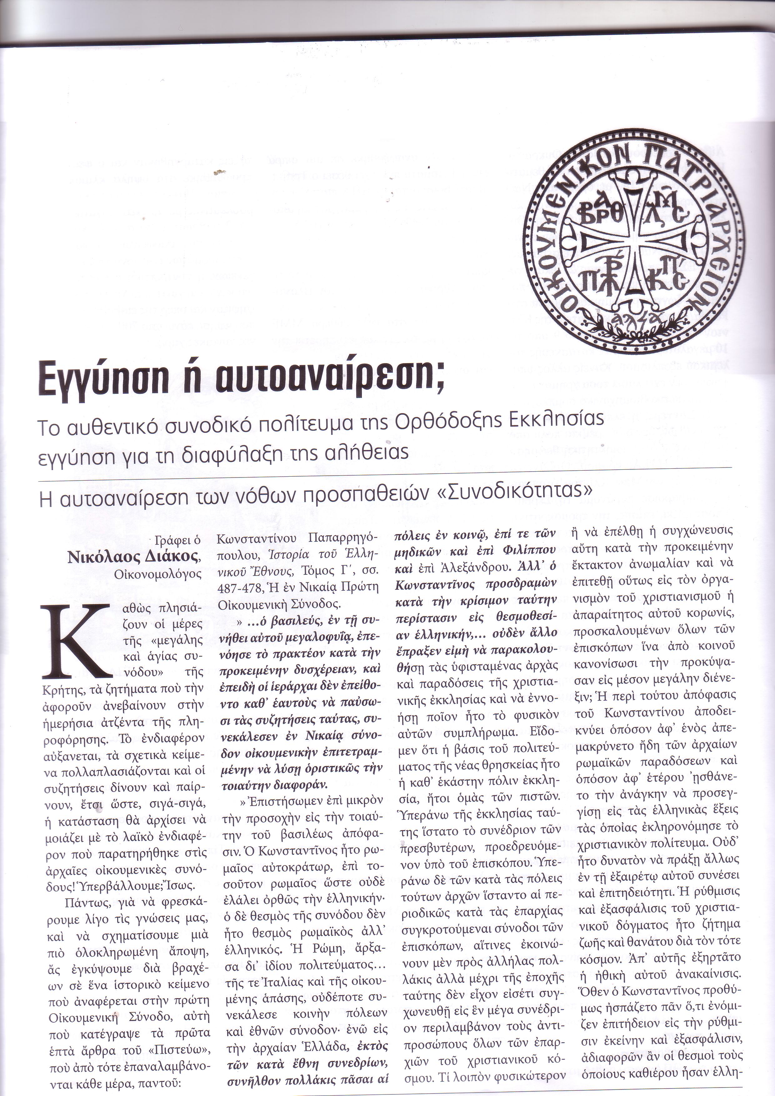 Εἶναι ἀναμφισβήτητο ὅμως, ὅτι αὐτὸ ποὺ βιώνουμε τὶς τελευταῖες δεκαετίες, εἶναι ἡ ἐπιβολὴ τοῦ ἀντιδημοκρατικοῦ παπικοῦ συστήματος καὶ στὰ δικά μας ἐκκλησιαστικὰ πράγματα. Κορύφωση φαίνεται ὅτι ἀποτελεῖ ἡ ἐπικείμενη σύνοδος τῆς Κρήτης στὶς 16 Ἰουνίου.