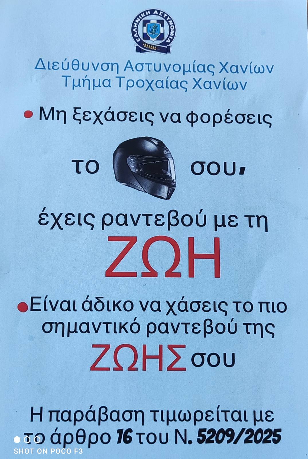Μία σημαντική ενημερωτική δράση με επίκεντρο την πρόληψη τροχαίων ατυχημάτων και την προστασία της ανθρώπινης ζωής πραγματοποιήθηκε στα Χανιά την Πέμπτη 11 Ιουλίου 2025. Η εκστρατεία, υπό την αιγίδα της Διεύθυνσης Αστυνομίας Χανίων και του Τμήματος Τροχαίας Χανίων, εντάσσεται στο πλαίσιο της πανελλαδικής πρωτοβουλίας με τίτλο «Μηδενική ανοχή στη μη χρήση κράνους», που στοχεύει στην ουσιαστική ενίσχυση της οδικής ασφάλειας.