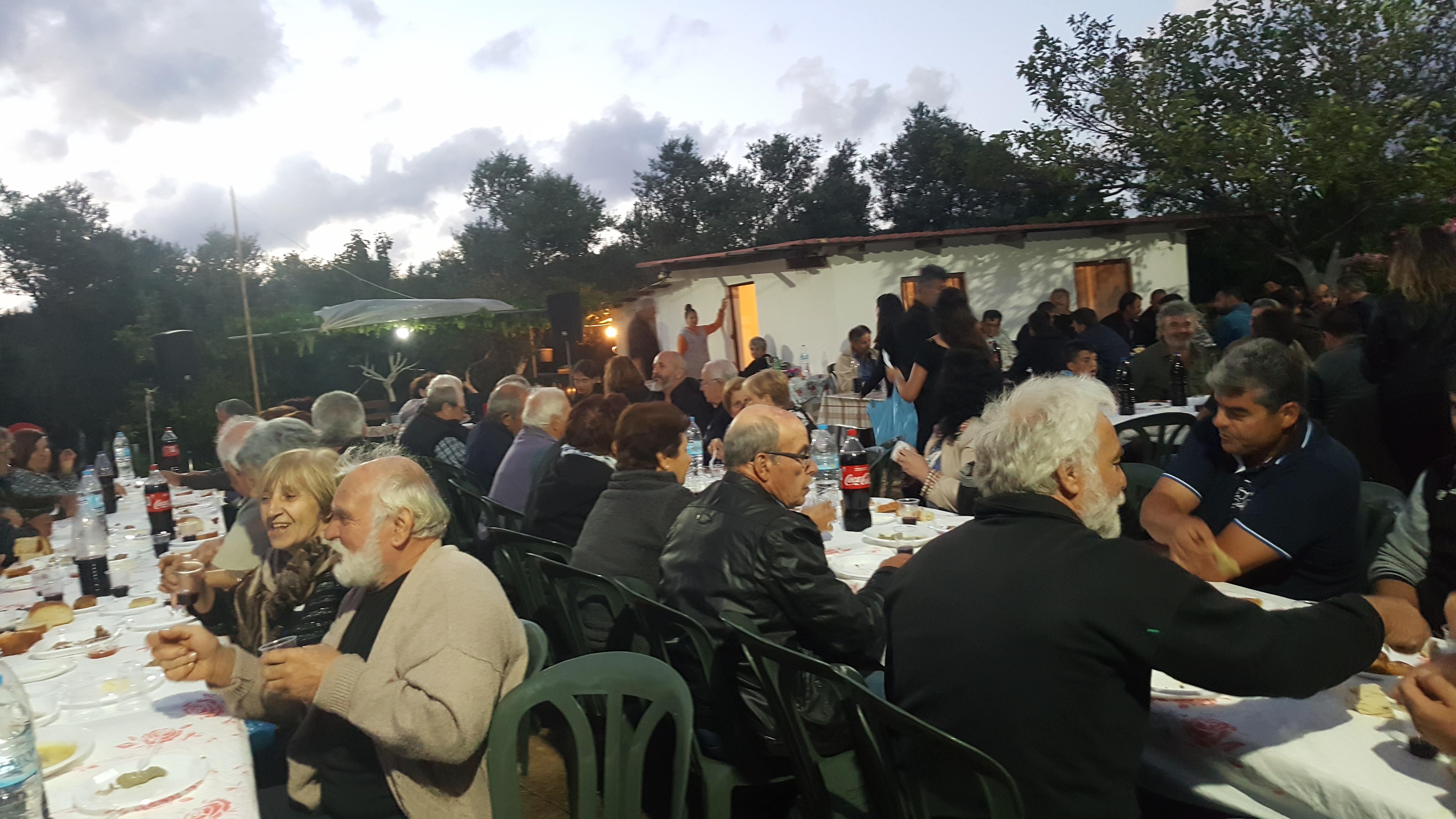 Και μετά ακολούθησε παραδοσιακό γλέντι με όργανα Κρητικά με το συγκρότημα Μαρτσάκη Γιάννη και Μπομπολάκη Μανώλη. Τραπέζια στρώθηκαν για 200 περίπου άτομα όπου προσφέρθηκε και του «πουλιού το γάλα». Άφθονοι μεζέδες από τυριά, στάκες, καλτσούνια, μέλια και όλα τα εκλεκτά Κρητικά φαγητά μαγειρεμένα από τις νοικοκυρές γυναίκες της οικογένειας. Με αγνά ντόπια κρέατα και υλικά. Τα πιλάφια πήγαιναν και ερχόταν τσιγαριαστά κρέατα δικά τους ζώα που βόσκουν στα βουνά, τα βραστά, ψητά, τα κουνέλια. Πεντανόστιμα όλα, καλομαγειρεμένα και αγνά κρέατα, καθαρά! Μα, και γαρδούμια που είναι δύσκολα, είχαν φτιάξει για όλο τον κόσμο! Και αυγοκαλάμαρα και δίπλες και ό,τι εκλεκτό διαθέτει η Κρητική κουζίνα.Τα όργανα έπαιζαν ωραίους σκοπούς και μεις σκεφτόμαστε βλέποντάς τα : «Όσο ζει η παράδοση θα ζει η Ελλάδα. Τίποτα δεν θα μπορέσει να την διαβρώσει»!