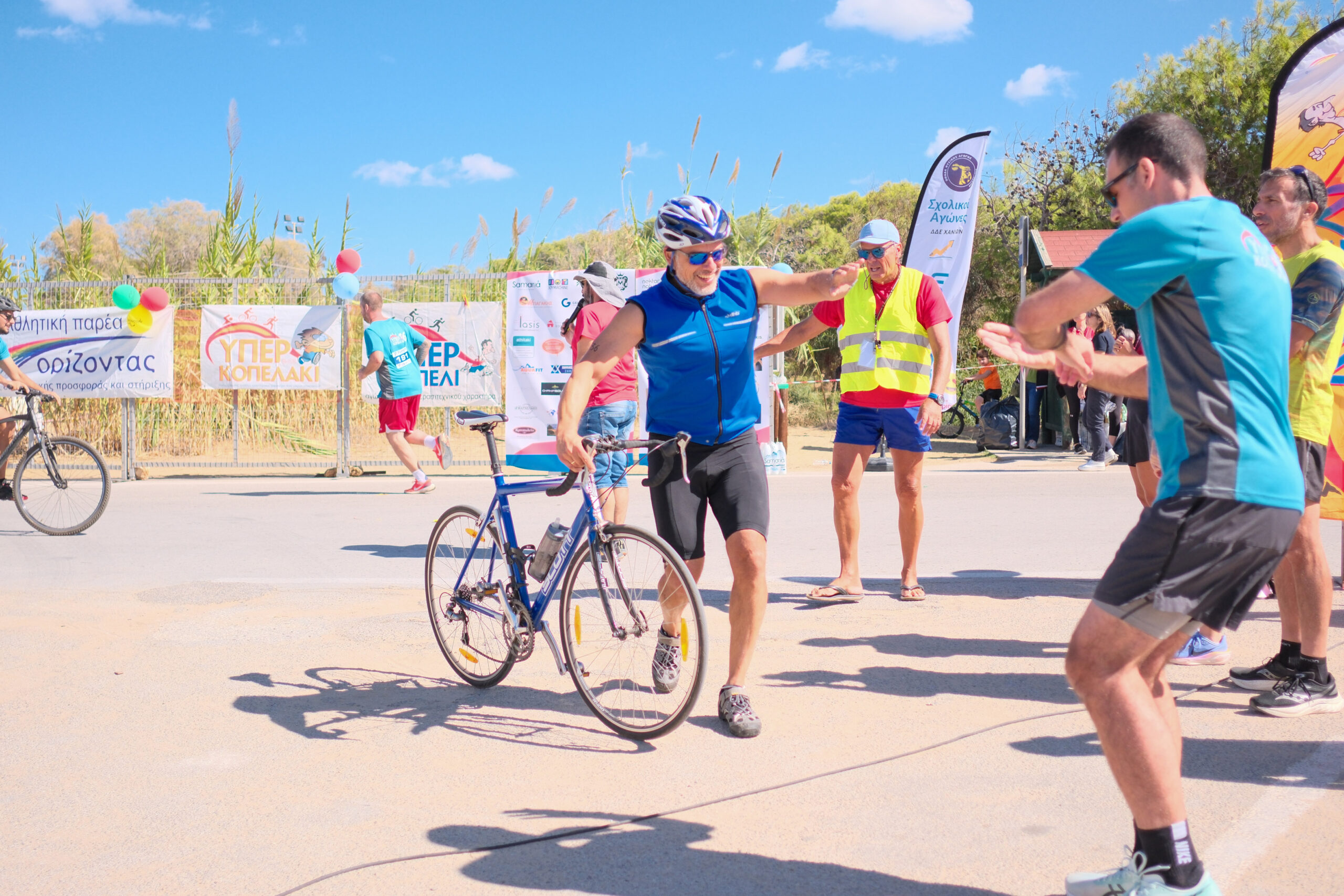 Στις 12:30 ακολούθησε το «Υπερκοπέλι», ο κύριος αγώνας τριάθλου για ενήλικες. Εδώ, η πρόκληση δεν ήταν η επίδοση αλλά η συμμετοχή. Κάθε βήμα, κάθε πεταλιά, κάθε stroke στο νερό ήταν μια προσφορά: μια ενίσχυση στον σκοπό του Ορίζοντα και μια δήλωση αλληλεγγύης προς όσους δοκιμάζονται από την ασθένεια.