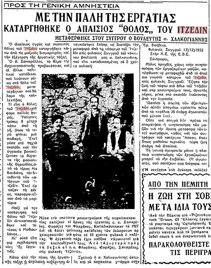 Ομάδα Σύνταξης, «Με την πάλη της εργατιάς καταργήθηκε ο απαίσιος “θόλος” του Ιτζεδίν», Ριζοσπάστης, 19/12/1932