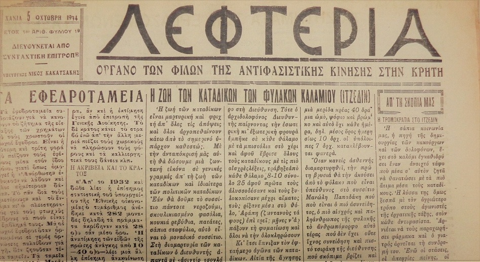 Γιατράκης Αντρέας, «Η ζωή των καταδίκων των Φυλακών Καλαμίου (Ιτζεδίν)», Λευτεριά (Όργανο της Αντιφασιστικής Κίνησης στην Κρήτη), Παρασκευή 5 Οχτώβρη 1934, σελ. 1.
