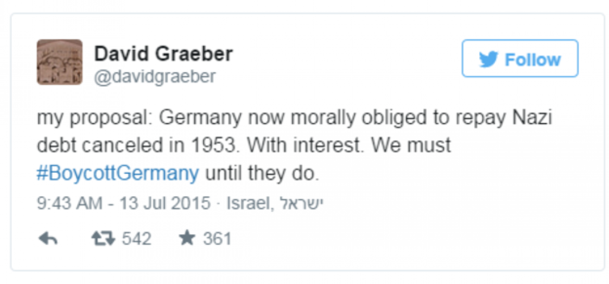 Ένα από τα πιο διαδεδομένη μηνύματα από τον David Graeber, έναν αμερικάνο αναρχικό ακτιβιστή και καθηγητή ανθρωπολογίας στο London School of Economics. Αναφέρεται στο κούρεμα των χρεών του ναζιστικού καθεστώτος μετά τον Β¨ Παγκόσμιο Πόλεμο.