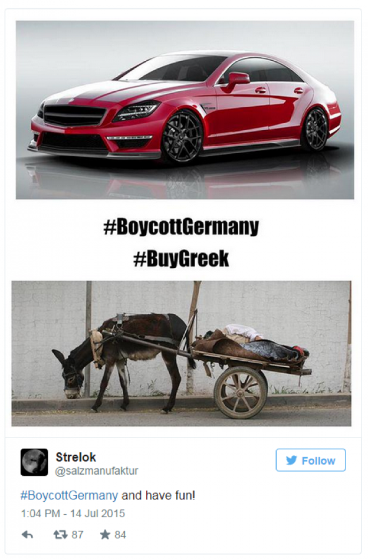 Ο Γερμανός δημοσιογράφος Thomas Walde με ιδιαίτερο αναφέρει: “Το ελληνικό αίτημα για μποϊκοτάζ στη Γερμανία συμπεριλαμβάνει και τα χρήματα του πακέτου στήριξης από τη Γερμανία; Όχι; Καλώς τότε”