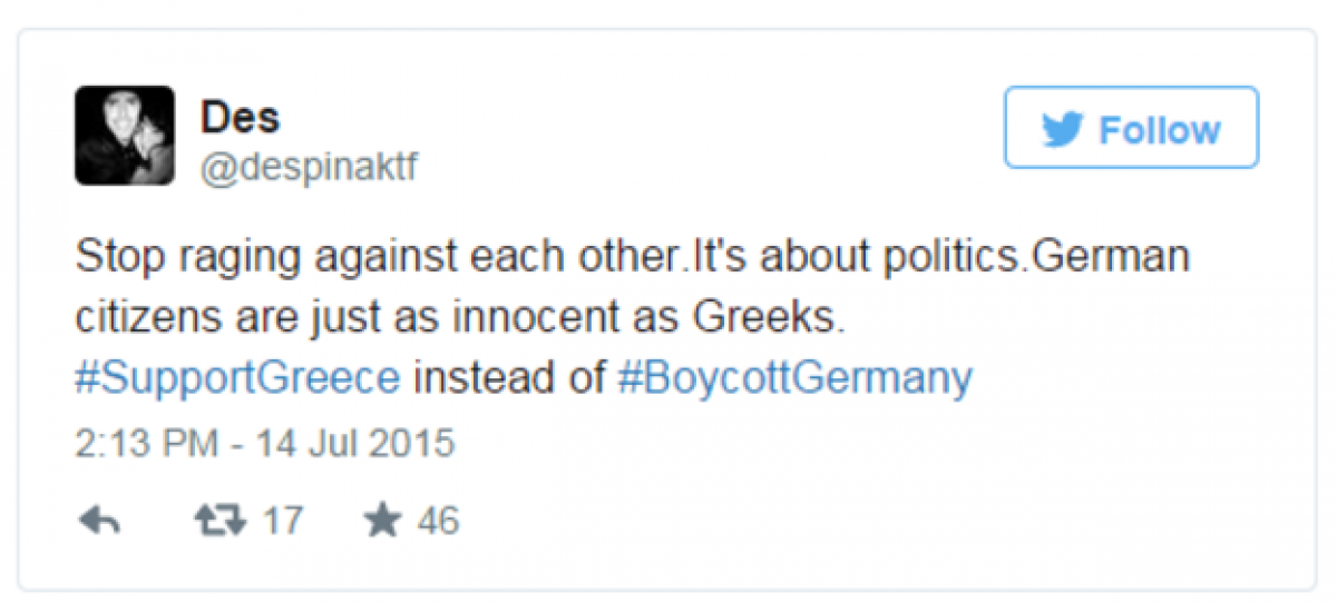 Οι Γερμανοί πολίτες πάντως δεν φαίνονται ικανοί να καταλαβουν τους λόγους που δημιουργήθηκε αυτή η αντίδραση και έτσι δημιούργησαν και αυτοί ένα hashtag που καλούν σε μποϊκοτάρισμα των ελληνικών προϊόντων.