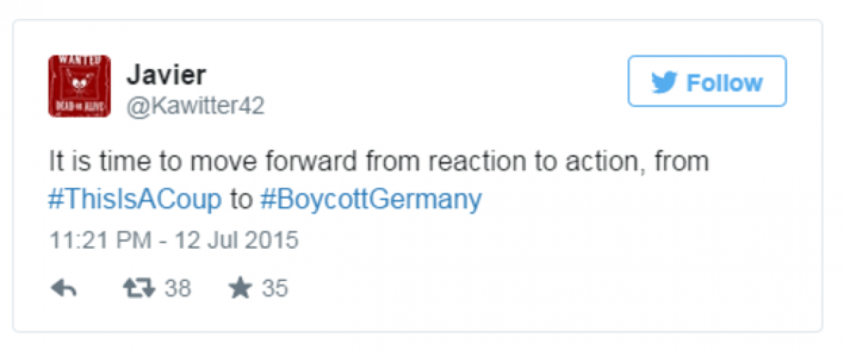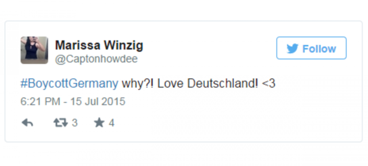 Το hashtag #BoycottGermany αναφέρθηκε για πρώτη φορά στο twitter κατά τη διάρκεια του σαββατοκύριακου, όμως άρχισε να κινείται από τη Δευτέρα. Μέχρι το μεσημέρι της Δευτέρας έχουν υπάρξει πάνω από 30.000 αναφορές σε όλη την Ευρώπη.