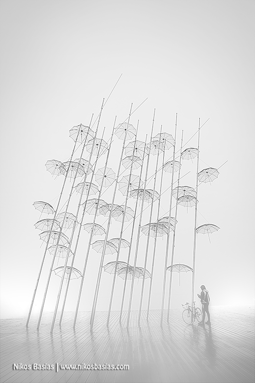 Η φωτογραφία «UMBRELLAS THESSALONIKI» που παρουσιάζει το έργο «Ομπρέλες» του Γιώργου Ζογγολόπουλου, που είναι τοποθετημένες στην Νέα Παραλία της Θεσσαλονίκης, φωτογραφιμένες μία μέρα με ομίχλη, κέρδισε Δύο βραβεία.