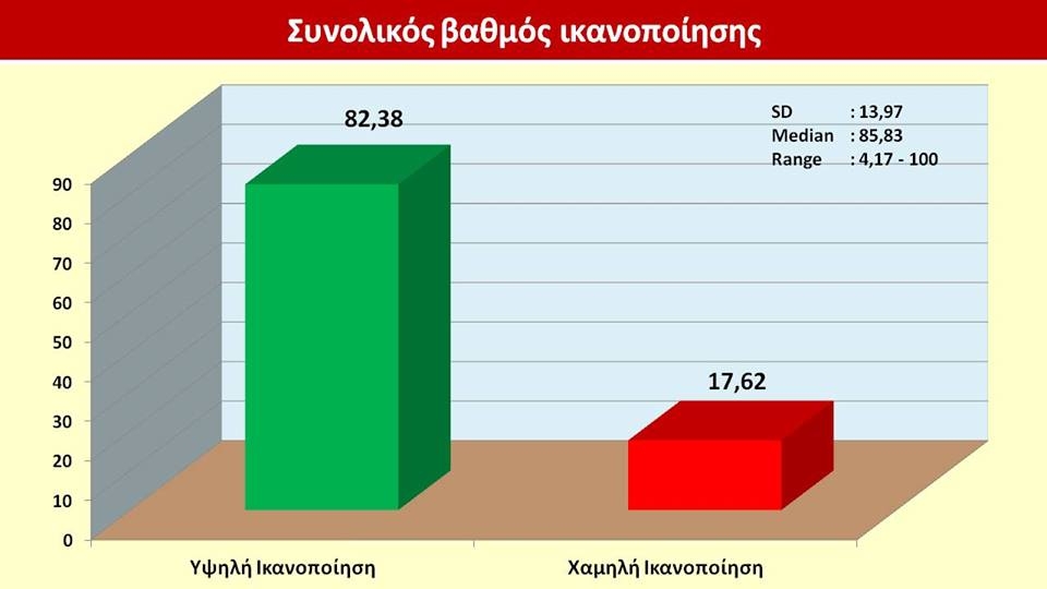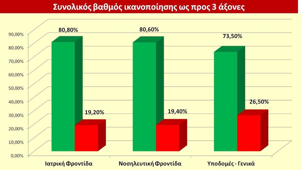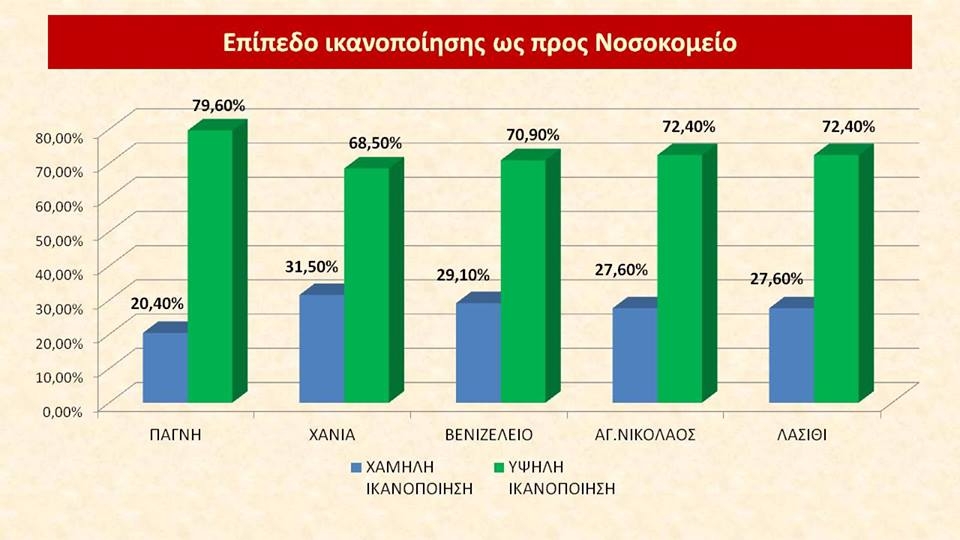 Aξίζει ωστόσο να σημειώσουμε ότι παρά την κρίση, η συντριπτική πλειοψηφία των νοσηλευθέντων ασθενών εκφράζει υψηλό βαθμό ικανοποίησης σε ποσοστό 82,38% από την παροχή υπηρεσιών στα δημόσια νοσοκομεία της Κρήτης (δείγμα 1003 ασθενών, περίοδος δειγματοληψίας 25/2/16-1/9/16)