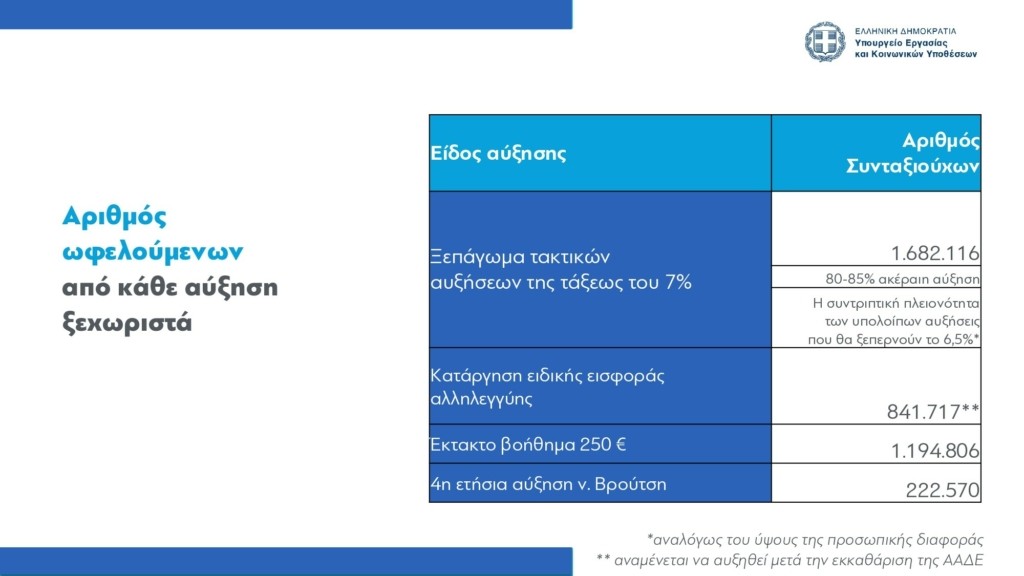 1) Από την οριζόντια αύξηση του 7% θα ωφεληθούν 1.682.116 συνταξιούχοι.