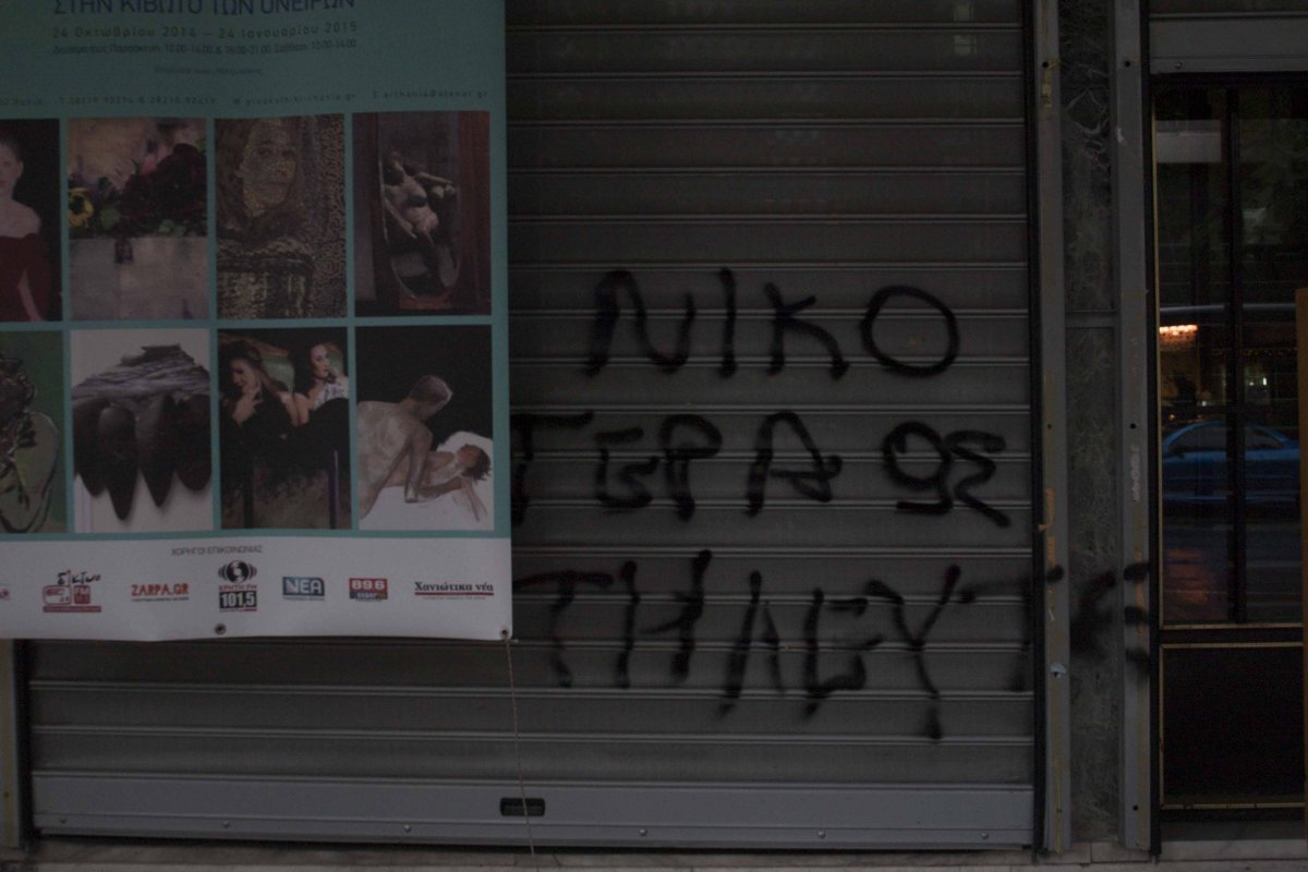 Όπως φαίνεται και στις φωτογραφίες τα στόρια έχουν κατέβει μερικώς και πάνω τους έχουν γραφτεί συνθήματα υπέρ του 21χρονου Νίκου Ρωμανού. Μας πληροφόρησαν ότι καθημερινά θα γίνεται συνέλευση όπου θα μπορεί να συμμετέχει ο καθένας που υποστηρίζει τον αγώνα του απεργού πείνας, ενώ η ώρα θα ανακοινώνεται μέσω ιστοσελίδων εναλλακτικής ενημέρωσης όπως το candiaalternative.info και athens.indymedia.org.