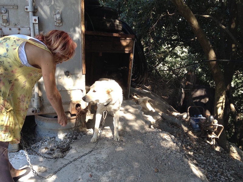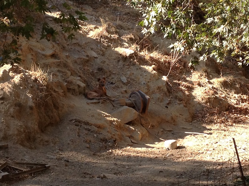 Δυστυχώς όμως  συμπτωματικά ανακαλύψαμε , ότιυπήρχε και τρίτο σκυλί, 2-3 μηνών καθαρόαιμο γκέκα , δεμένο σε απόμερο μέρος , χωρίς νερό πουθενά ,με στεγνά τελείως τα “σκεύη” τροφής και νερού , να έχει τρελαθεί απο την προσπάθειά του να ελευθερωθεί .