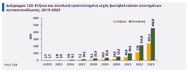 Έτσι προχώρησε -με πολλά εμπόδια- η υλοποίηση των εφαρμογών ενεργειακού συμψηφισμού, σαν μια κατηγορία έργων ανάμεσα στις πολλές χωρίς να περιορίζει τις άλλες κατηγορίες στο ελάχιστο, με τις συνολικά εγκατεστημένες μονάδες αυτοκατανάλωσης στη χώρα να αριθμούν, το 2023, ισχύ 456,9 MW, όσο δηλαδή ένα έργο ανανεώσιμων πηγών ενέργειας μεγάλης κλίμακας!