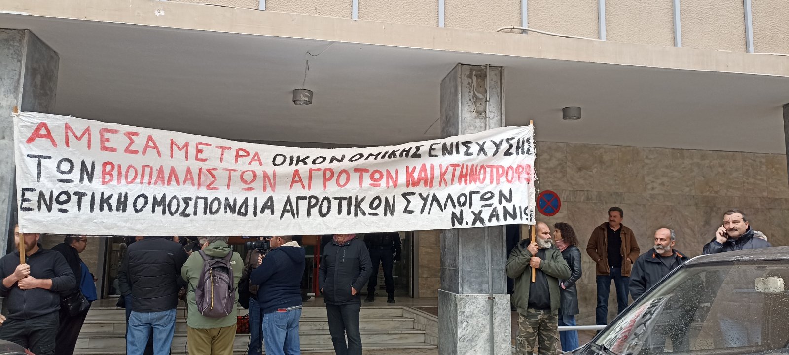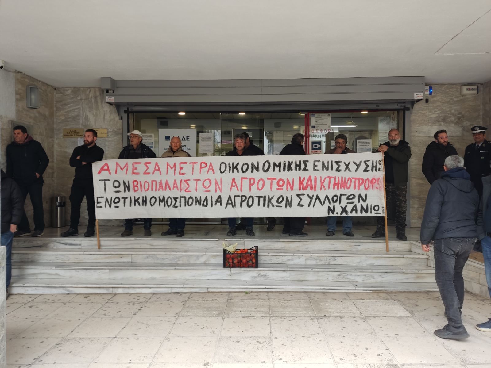 Συμβολική διαμαρτυρία έξω από το κτήριο της ΔΟΥ Χανίων πραγματοποίησαν το μεσημέρι της Πέμπτης αγρότες της Ενωτικής Ομοσπονδίας Αγροτικών Συλλόγων Ν. Χανίων, συνεχίζοντας τις κινητοποιήσεις τους με βασικό αίτημα την ουσιαστική στήριξη του αγροτικού κλάδου.