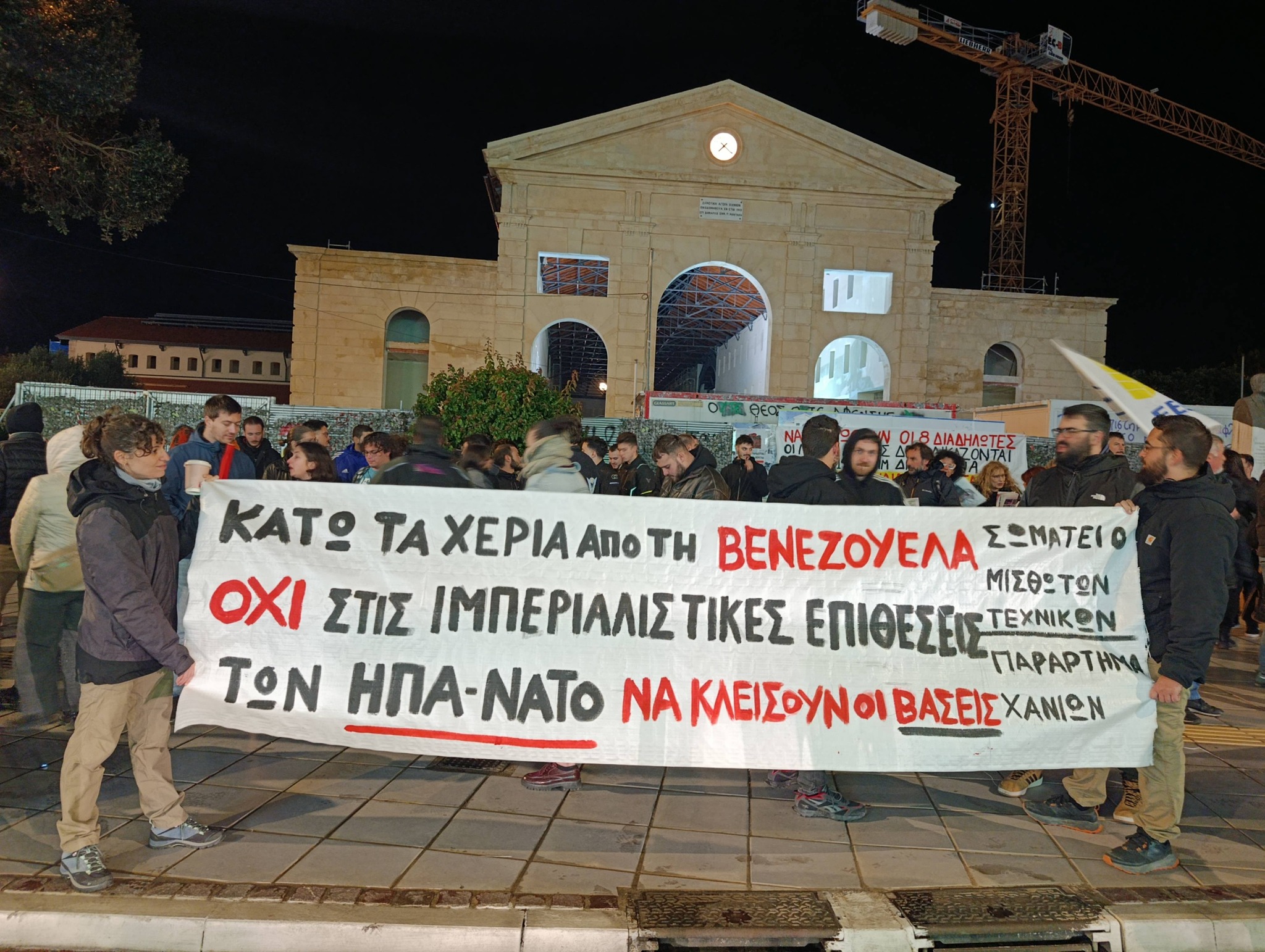 Με κεντρικό σύνθημα την καταδίκη της στρατιωτικής επέμβασης των Ηνωμένων Πολιτειών στη Βενεζουέλα, πραγματοποιήθηκε σήμερα το απόγευμα, στις 18:00, συγκέντρωση διαμαρτυρίας στην Πλατεία της Δημοτικής Αγοράς στα Χανιά.
