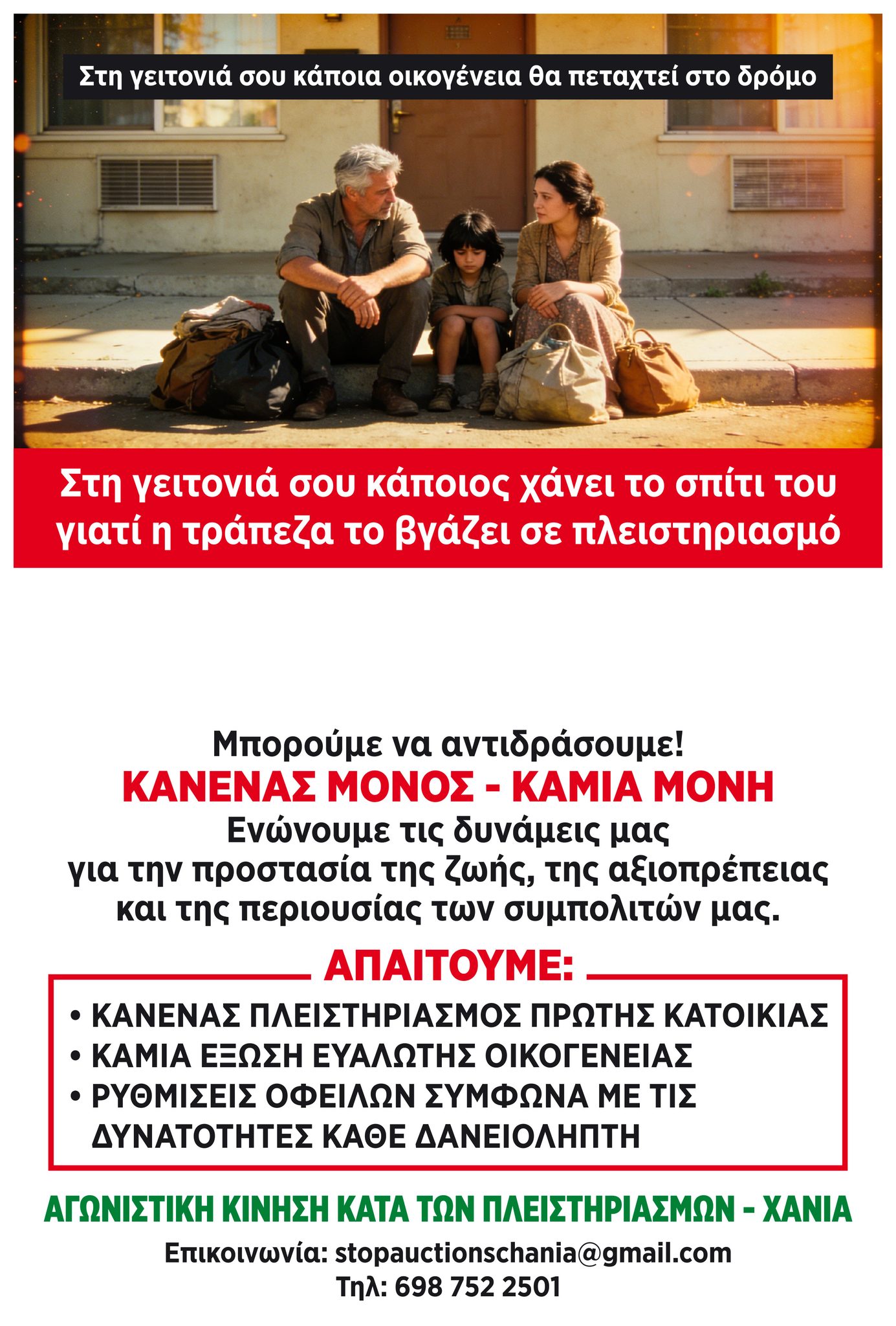 Στις γειτονιές των Χανίων μεταφέρεται το επόμενο διάστημα η δράση της «Αγωνιστικής Κίνησης κατά των πλειστηριασμών», καθώς μέλη της προχωρούν στην τοιχοκόλληση ενημερωτικού υλικού που επικεντρώνεται στο ζήτημα των αναγκαστικών εκτελέσεων και των εξώσεων. Η πρωτοβουλία αυτή έρχεται ως συνέχεια της δράσης που ξεκίνησε η κίνηση από το καλοκαίρι του 2025, θέτοντας ως προτεραιότητα την προστασία των ευάλωτων νοικοκυριών της περιοχής.