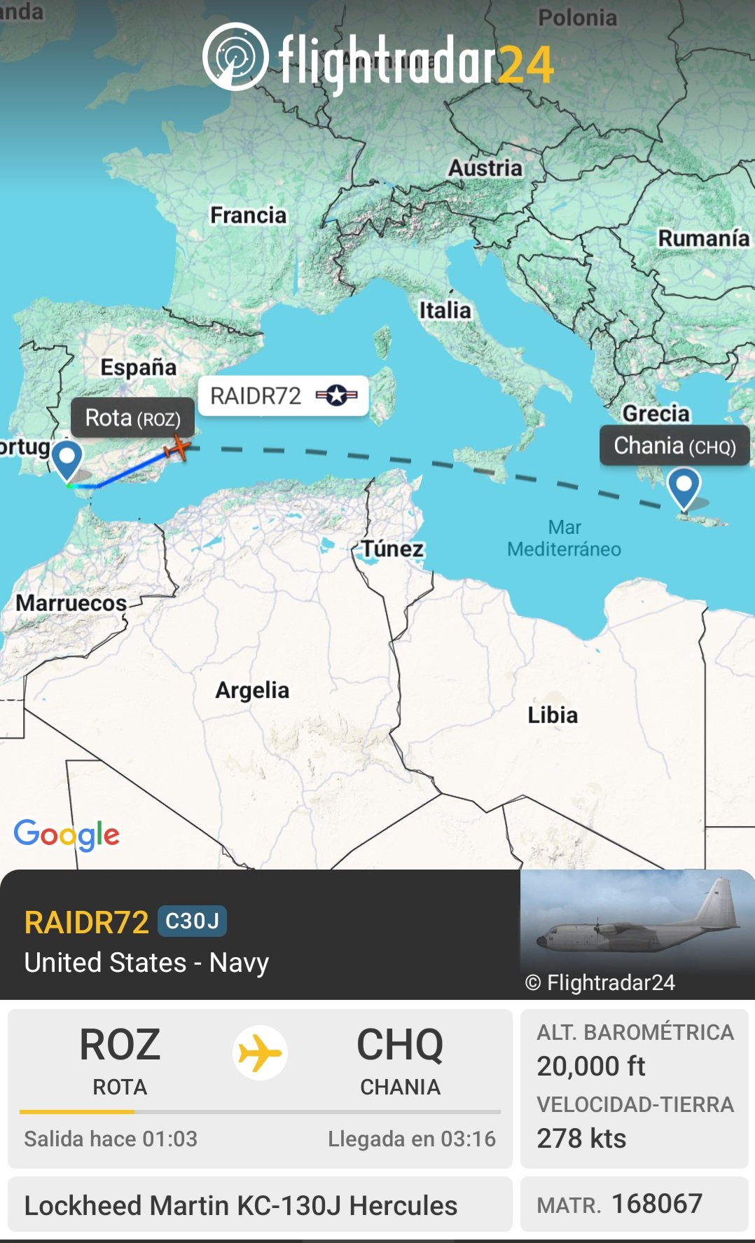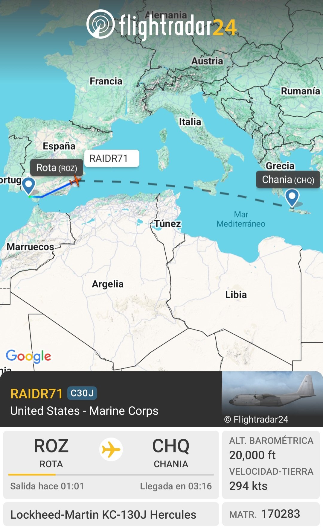 Την ίδια στιγμή, η ροή στρατιωτικού υλικού και προσωπικού από τη ναυτική βάση της Ρότα (Rota) στην Ισπανία προς την Κρήτη συνεχίζεται με αμείωτο ρυθμό. Σύμφωνα με δεδομένα πτήσεων, δύο ιπτάμενα τάνκερ του Σώματος Πεζοναυτών (USMC), τύπου KC-130 (RAIDR71 και RAIDR72), αναχώρησαν με προορισμό τον κόλπο της Σούδας.