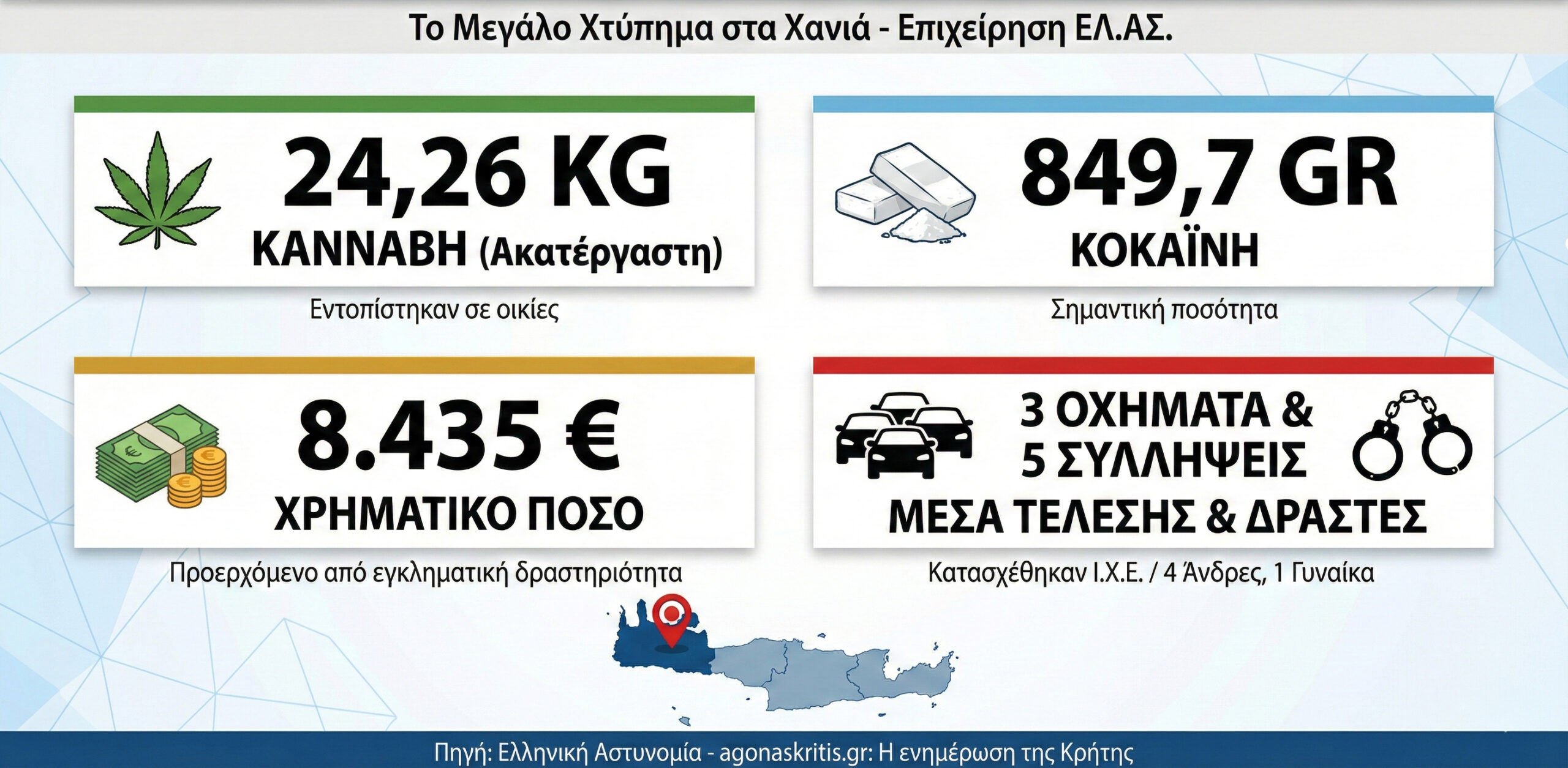 Χανιά: Στα χέρια της ΕΛ.ΑΣ. εγκληματική ομάδα ναρκωτικών – Κατασχέθηκαν 24 κιλά κάνναβης και κοκαΐνη