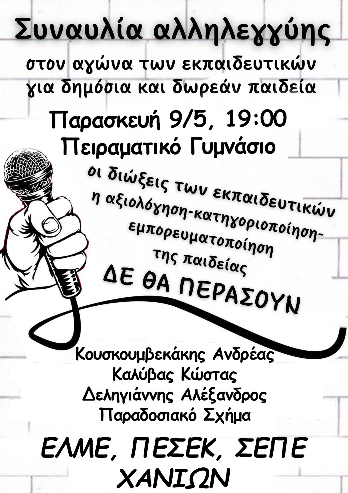 Σε ανοιχτό κάλεσμα συμμετοχής σε συναυλία αλληλεγγύης προχωρούν οι εκπαιδευτικοί φορείς των Χανίων, ενόψει της εκδίκασης την Παρασκευή 9 Μαΐου στο Διοικητικό Εφετείο Πειραιά της προσωρινής διαταγής για την αναστολή της απόφασης του πρώην υπουργού Επικρατείας, Κυριάκου Πιερρακάκη, περί δυνητικής αργίας της εκπαιδευτικού Χρύσας Χοτζόγλου.