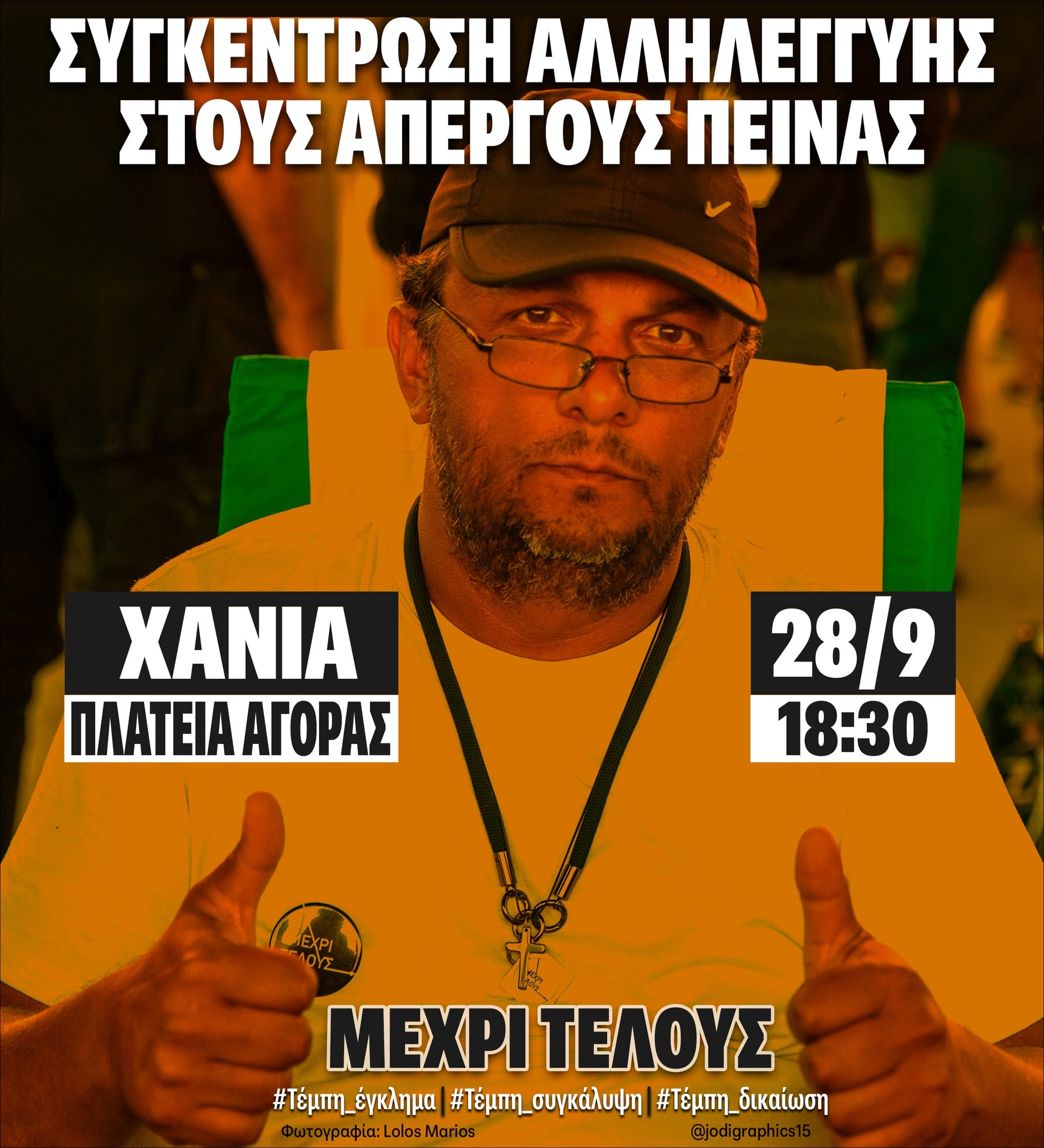 Σήμερα Κυριακή 28 Σεπτεμβρίου, στις 18:30, η Πλατεία Αγοράς Χανίων θα φιλοξενήσει μια σημαντική κινητοποίηση με κεντρικό αίτημα την αλληλεγγύη στους απεργούς πείνας και την απαίτηση για δικαιοσύνη στα Τέμπη. Το κάλεσμα απευθύνει η Πρωτοβουλία Πολιτών ΟΞΥΓΟΝΟ, συνεχίζοντας τη δράση της μετά το ψήφισμα της 19ης Σεπτεμβρίου υπέρ του απεργού πείνας κ. Ρούτσι.