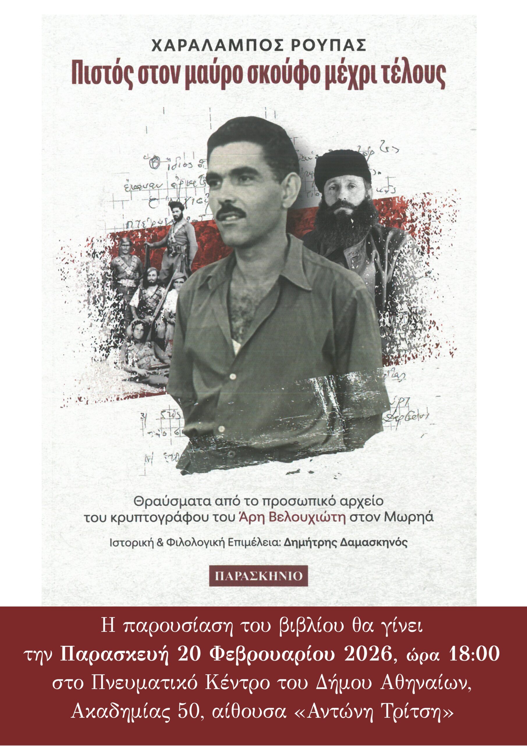 Την Παρασκευή 20 Φεβρουαρίου στις 6.00 μ.μ. παρουσιάζεται το βιβλίο του Χαράλαμπου Ρούπα με τίτλο «Πιστός στον μαύρο σκούφο μέχρι τέλους» από τις εκδόσεις Παρασκήνιο. Η παρουσίαση θα γίνει στο Πνευματικό Κέντρο του Δήμου Αθηναίων, Ακαδημίας 50.