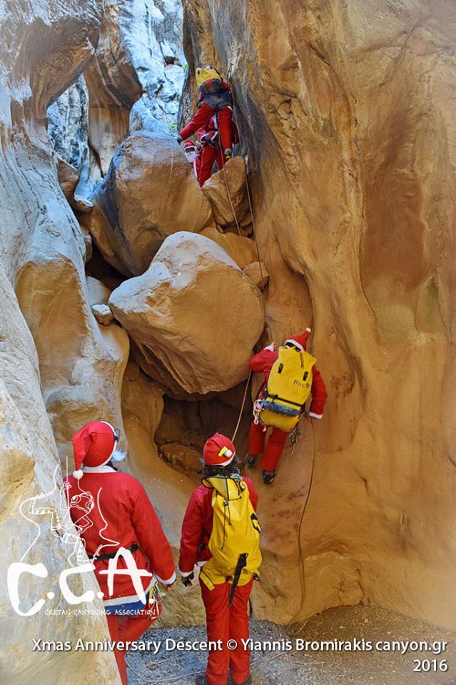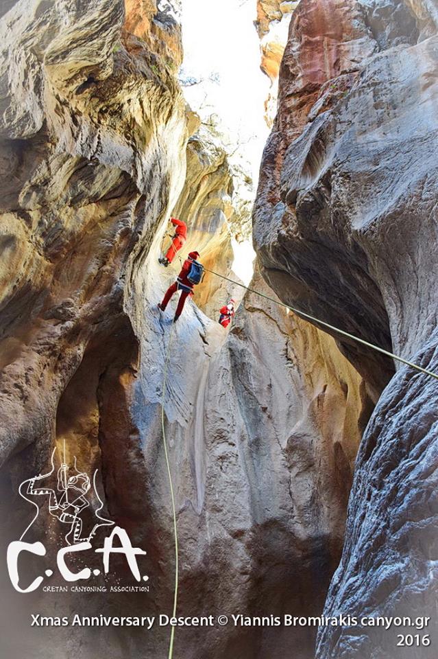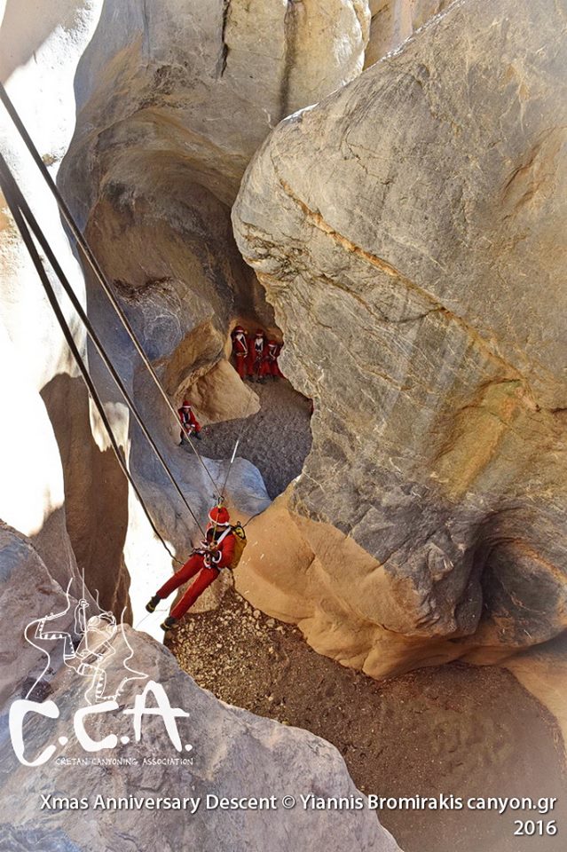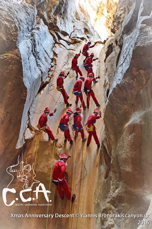 «Ο Παγκρήτιος Όμιλος Διάσχισης & Εξερεύνησης Φαραγγιών (Π.Ο.Ε.Φ.-www.canyon.gr) διοργάνωσε την Κυριακή 18.12.2016 Χριστουγεννιάτικη επετειακή κατάβαση στο άβατο φαράγγι του Καβουσίου στην περιοχή της Κερατόκαμπου. Δώδεκα μέλη του ομίλου ντύθηκαν στα χρώματα του Αϊ Βασίλη και με γιορτινή διάθεση πραγματοποίησαν τεχνική κατάβαση φαραγγιού.