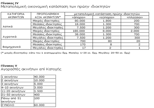 Το πρώτο δεδομένο αφορά τα μεγέθη του φαινομένου. Οπως φαίνεται από τον Πίνακα Ι, μέσα στην κατοχή άλλαξαν χέρια 350.000 περίπου ακίνητα. Το ένα τρίτο απ’ αυτά ήταν «αστικά» (σπίτια και οικόπεδα), τα δυο τρίτα «αγροτικά» (δηλαδή χωράφια, συχνά στην περίμετρο των αστικών κέντρων, συμπεριλαμβανομένου του μεγαλύτερου μέρους των σημερινών πολεοδομικών συγκροτημάτων της Αθήνας και της Θεσσαλονίκης), ενώ πουλήθηκαν και 1.000 περίπου «βιομηχανικά» ακίνητα, ως επί το πλείστον βιοτεχνίες.