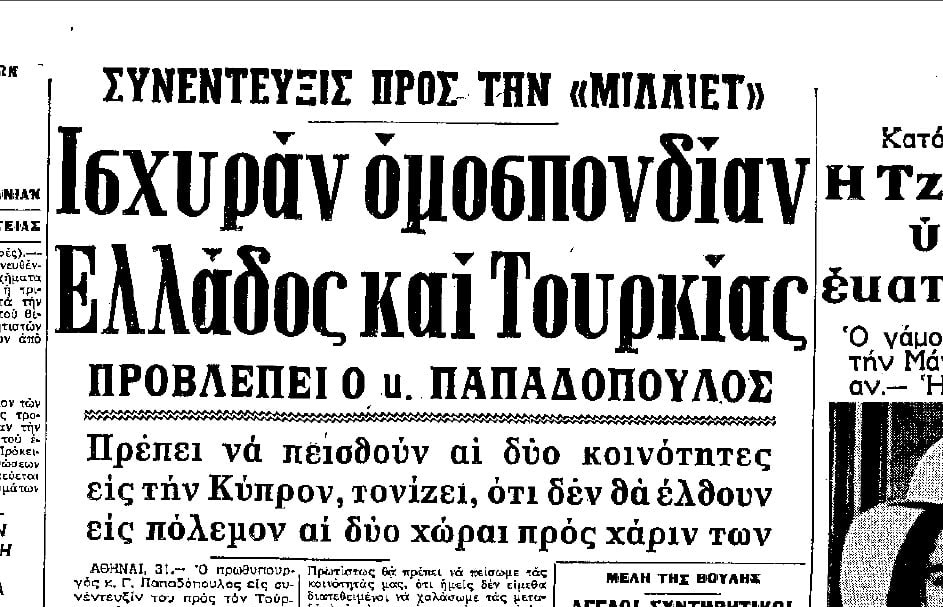Όταν ο δικτάτορας Παπαδόπουλος μιλούσε για την ανάγκη συνομοσπονδίας Ελλάδας – Τουρκίας: “Δε θα έλθουμε και σε πόλεμο για χάρη της Κύπρου”
