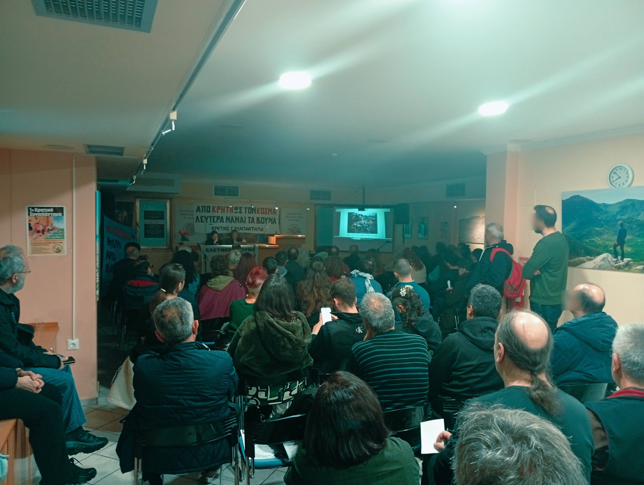 Μέσα από τεκμηριωμένες εισηγήσεις παρουσιάστηκε το εύρος της επίθεσης που εξελίσσεται στην Κρήτη: οι εξορύξεις υδρογονανθράκων, η εγκατάσταση βιομηχανικών ΑΠΕ σε βουνά και προστατευόμενες περιοχές, το δίκτυο πυλώνων και ενεργειακών διασυνδέσεων, η καταστροφή της Πεδιάδας Καστελλίου από τη μεταφορά του αεροδρομίου Ηρακλείου εκεί, η τουριστική και ενεργειακή υπερεκμετάλλευση, η παράδοση θαλάσσιων και νησιωτικών οικοσυστημάτων στα επενδυτικά συμφέροντα.