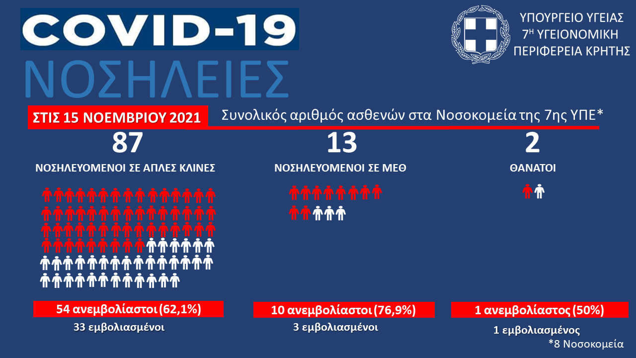 Ιδιαίτερο ενδιαφέρον έχει το γεγονός ότι το νοσοκομείο Χανίων έχει τη μεγαλύτερη επιβάρρυνση με 32 ασθενείς να νοσηλεύονται εκ των οποίων 3 είναι διασωληνωμένοι.