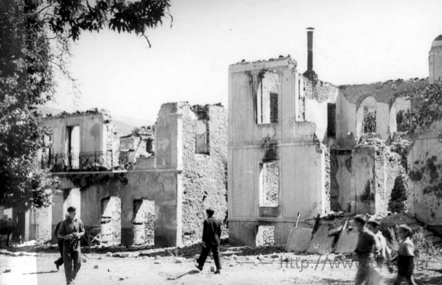 - Στις 28 Δεκεμβρίου 1943, η αναφορά δύο Ελληνίδων νοσοκόμων του Ελληνικού Ερυθρού Σταυρού κάνει λόγο για 360 κατεστραμμένα σπίτια (από τα οποία απόμειναν μόνο οι τέσσερεις εξωτερικοί τοίχοι), εκκλησίες και σχολεία. Διασώθηκαν μόνο 15 σπίτια.