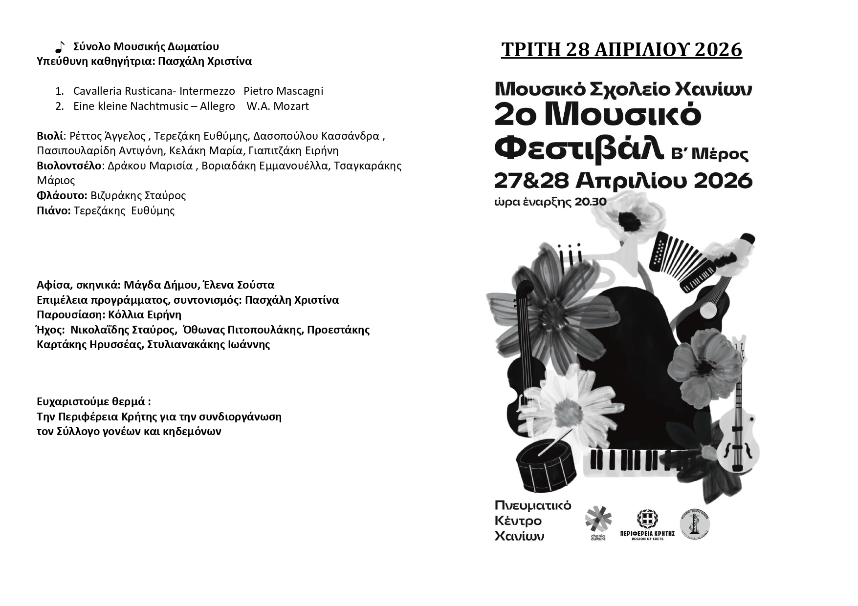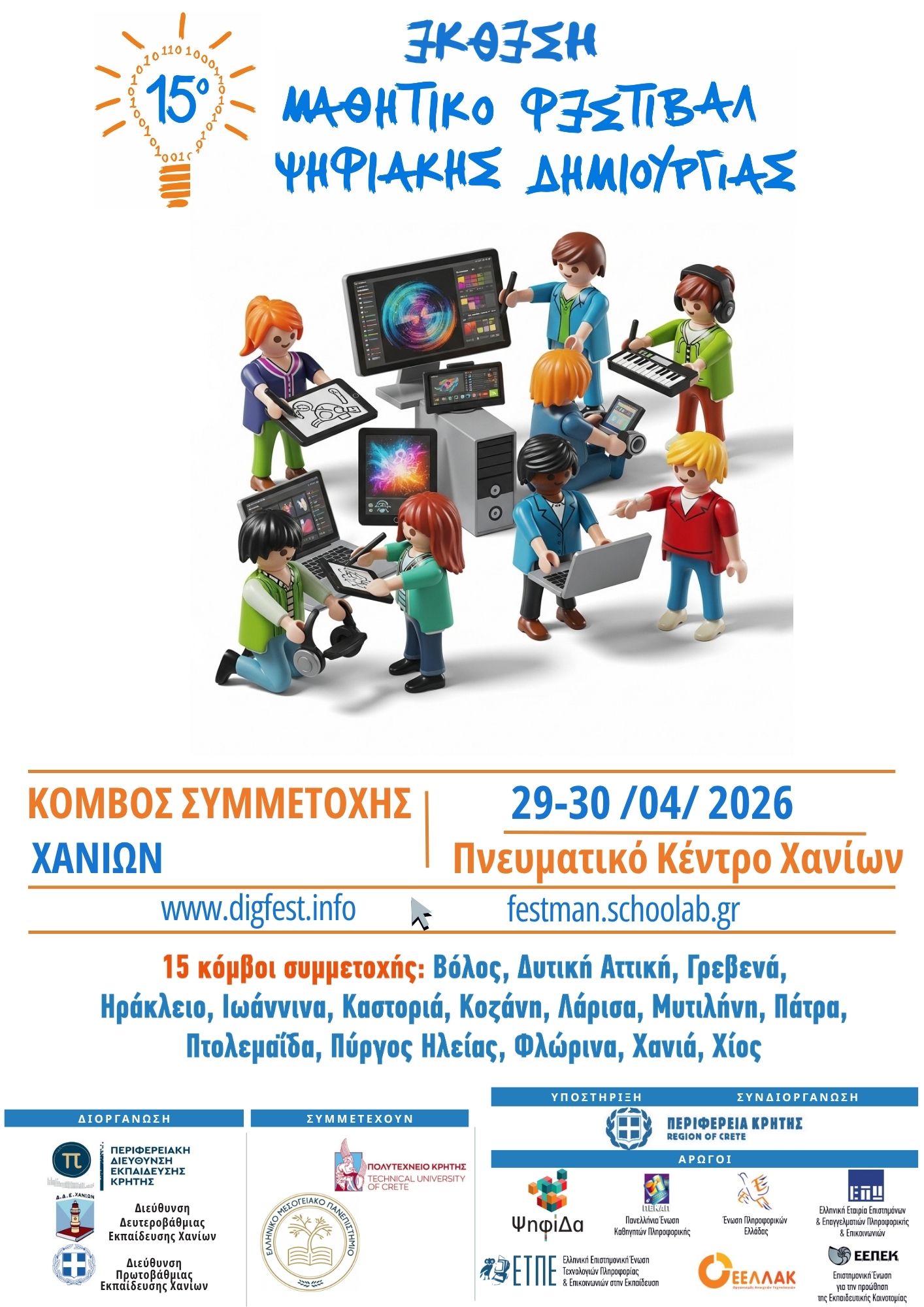 Το Πνευματικό Κέντρο Χανίων θα φιλοξενήσει στις 29 και 30 Απριλίου 2026 την 15η Έκθεση/Φεστιβάλ Μαθητικής Ψηφιακής Δημιουργίας, μια διοργάνωση που αναδεικνύει τη δημιουργικότητα και την ψηφιακή έκφραση των μαθητών της περιοχής.