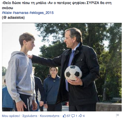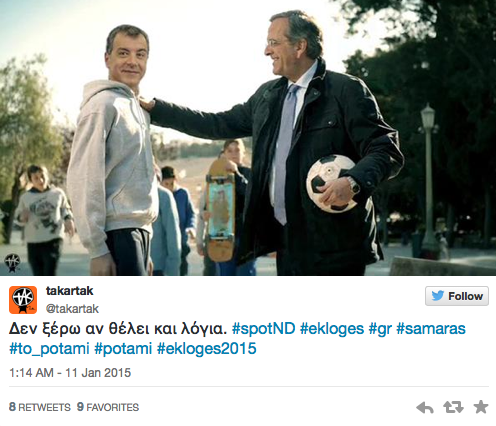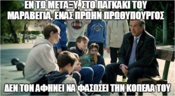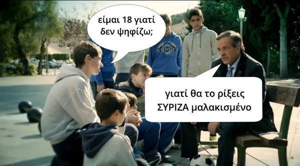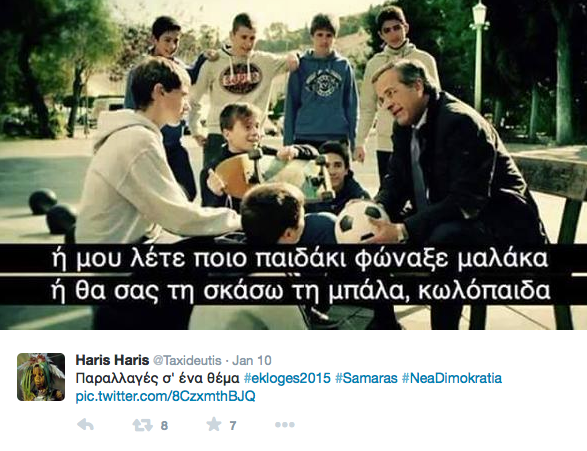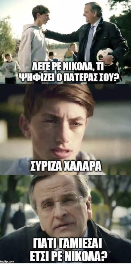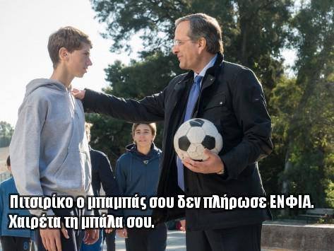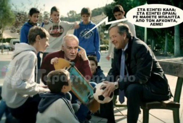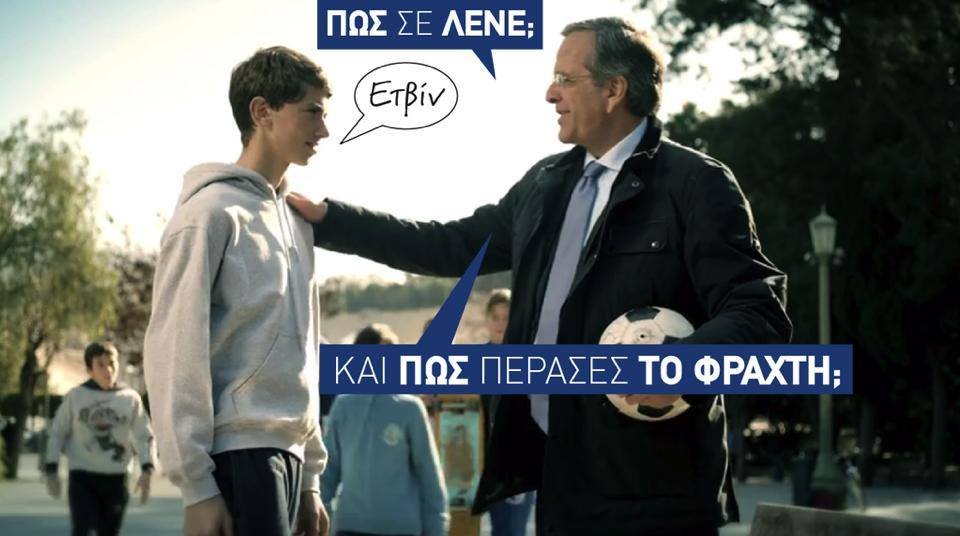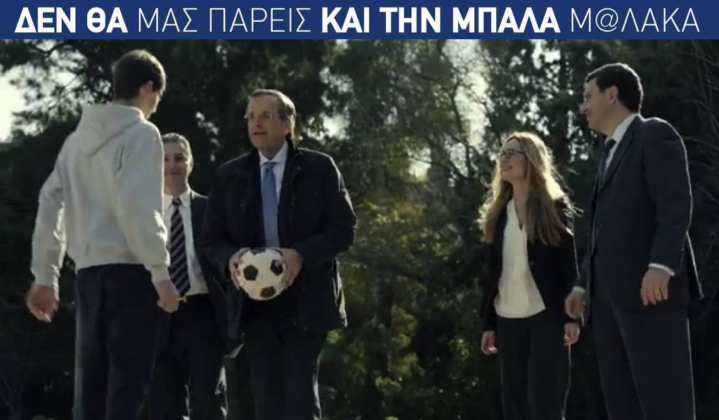 Η επιτυχία του επίσημου σποτ για την προεκλογική εκστρατεία της Νέας Δημοκρατίας είναι αδιαμφισβήτητη. Αλλά όχι όπως περιμένανε οι δημιουργοί του. Τις τελευταίες ώρες το ίντερνετ έχει πλημμυρίσει με φωτογραφίες και βίντεο που σατηρίζουν το προεκλογικό σποτ όπου ο πρωταγωνιστής Αντώνης Σαμαράς “παίζει μπάλα” με μια ομάδα παιδιών. Στο βίντεο ο μικρός Νικόλας λέει στον πρωθυπουργό ότι ο πατέρας του λέει ότι είναι δύσκολα τα πράγματα. Ο Αντώνης Σαμαράς καλεί τον Νικόλα να πει στον πατέρα του ότι η ΝΔ φτιάχνει το γήπεδο που χρειάζεται για να παίξει μπάλα η Ελλάδα.